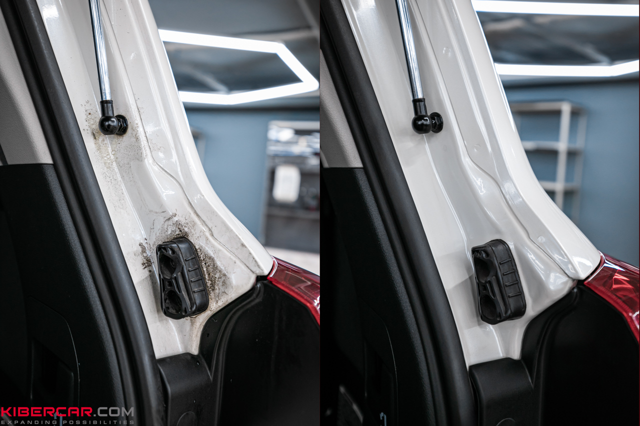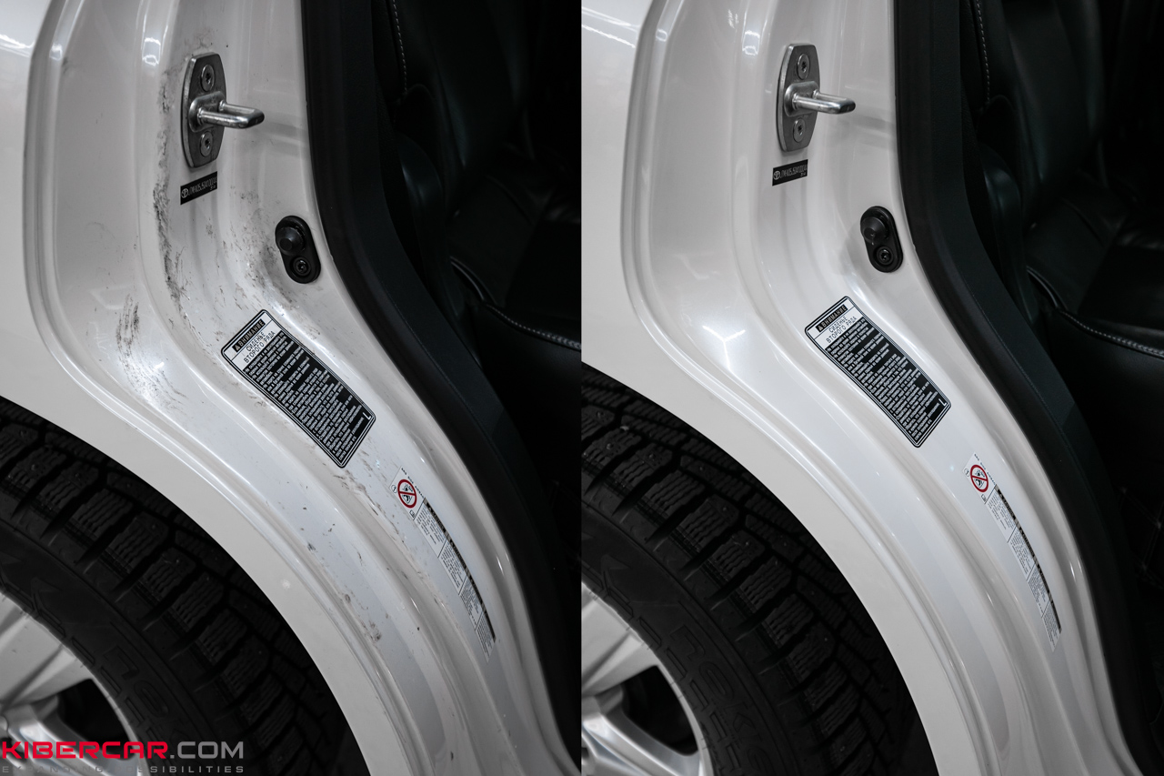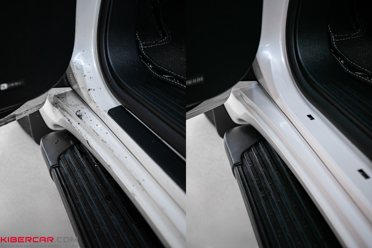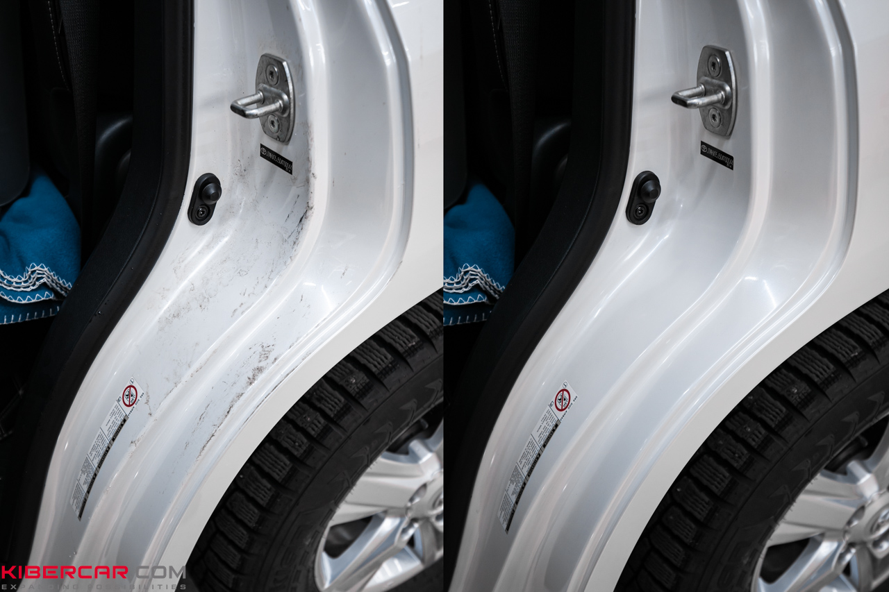 Химическая чистка порогов. После предварительного этапа мы использовали профессиональные моющие средства, которые полностью безопасны для лакокрасочного покрытия и пластика. Они разрушили остатки мастики, не повредив поверхность, а также устранили въевшуюся грязь и налет.
