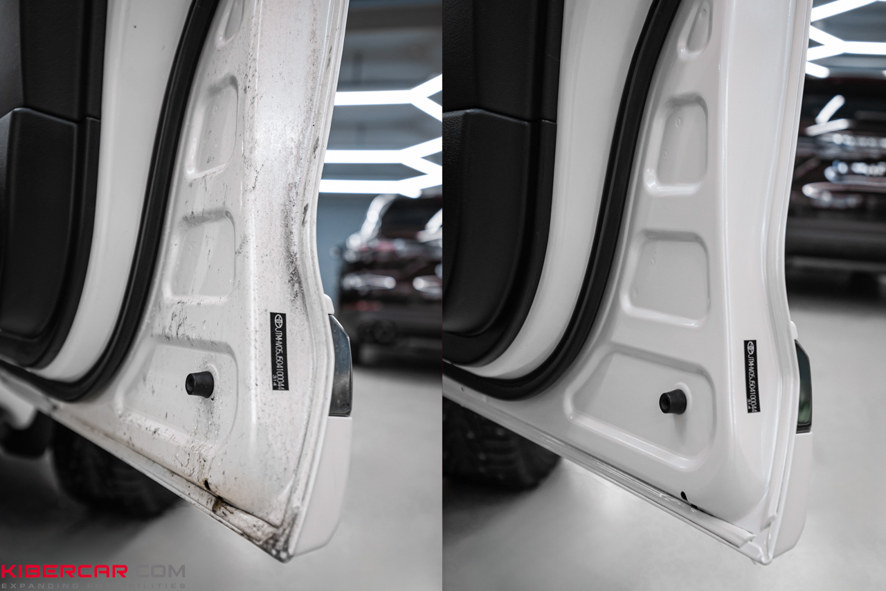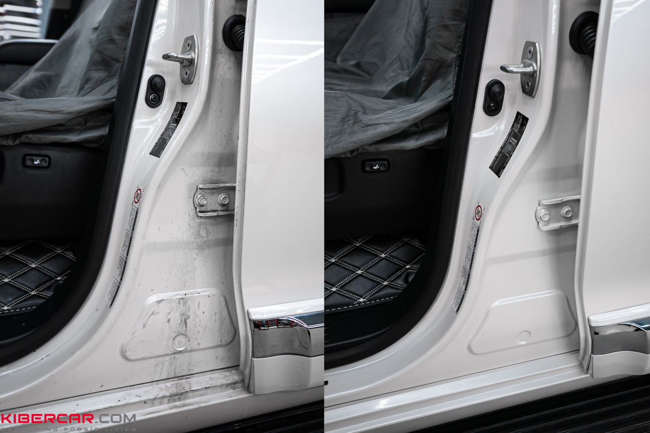 Осмотрев автомобиль, мы заметили, что основная проблема сосредоточена на порогах. Остатки антикоррозийной мастики, которые, вероятно, должны были служить защитным слоем, смешались с пылью и грязью. В результате, вместо защиты, мастика стала собирать загрязнения, особенно в углах и труднодоступных местах. Поскольку Land Cruiser 200 — это внедорожник с крупной рамой и сложной конструкцией порогов, такая задача требует особого подхода.