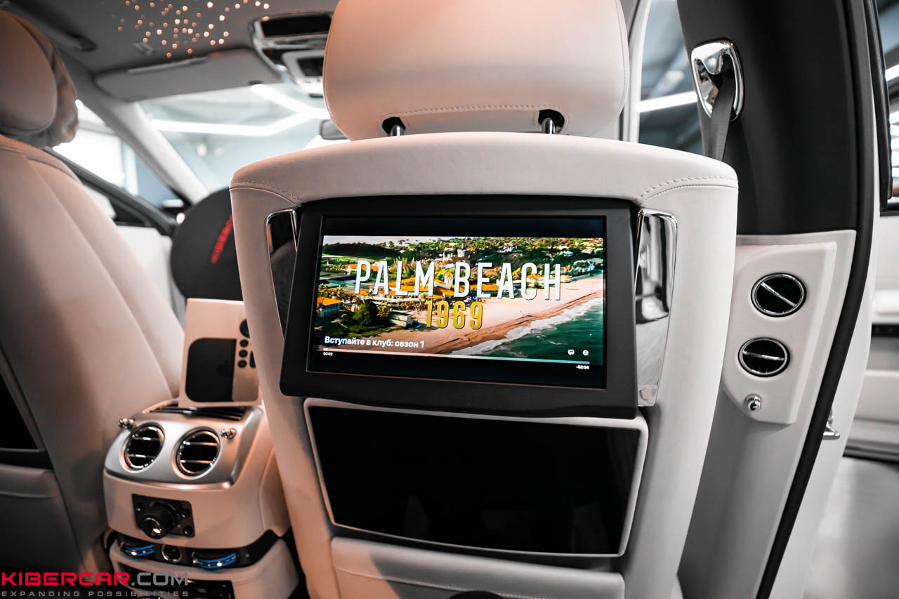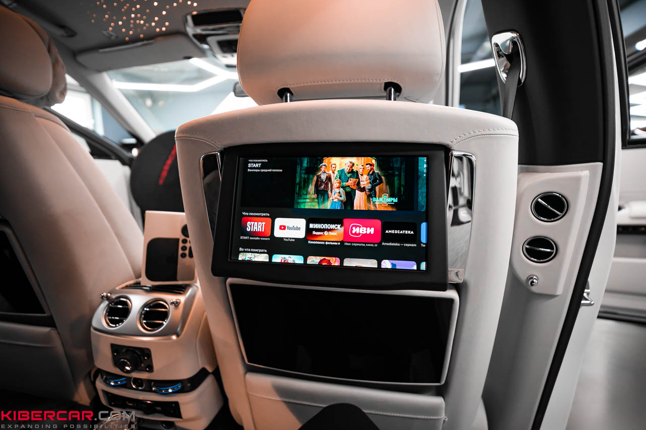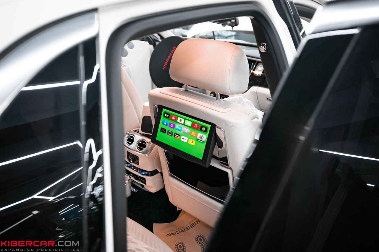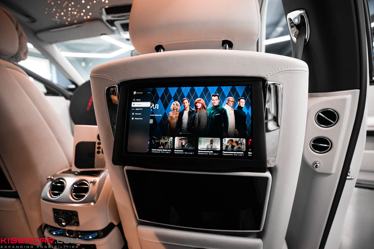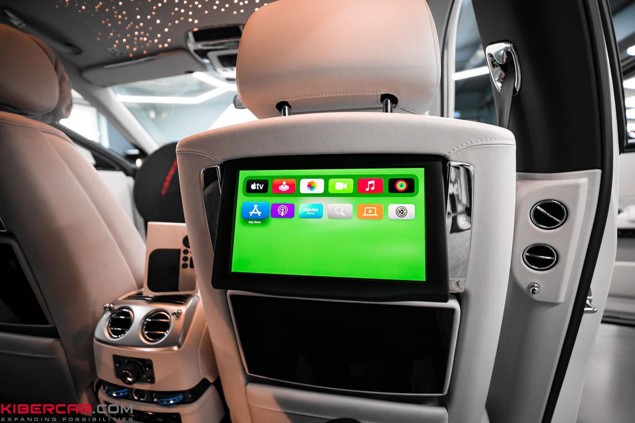 У автомобиля Rolls-Royce Ghost комплектация предусматривает штатные сенсорные мониторы для пассажиров на задних сиденьях. Чтобы обеспечить их качественным контентом и расширить возможности мультимедиа, наша команда провела дооснащение и установила приставку Apple TV.