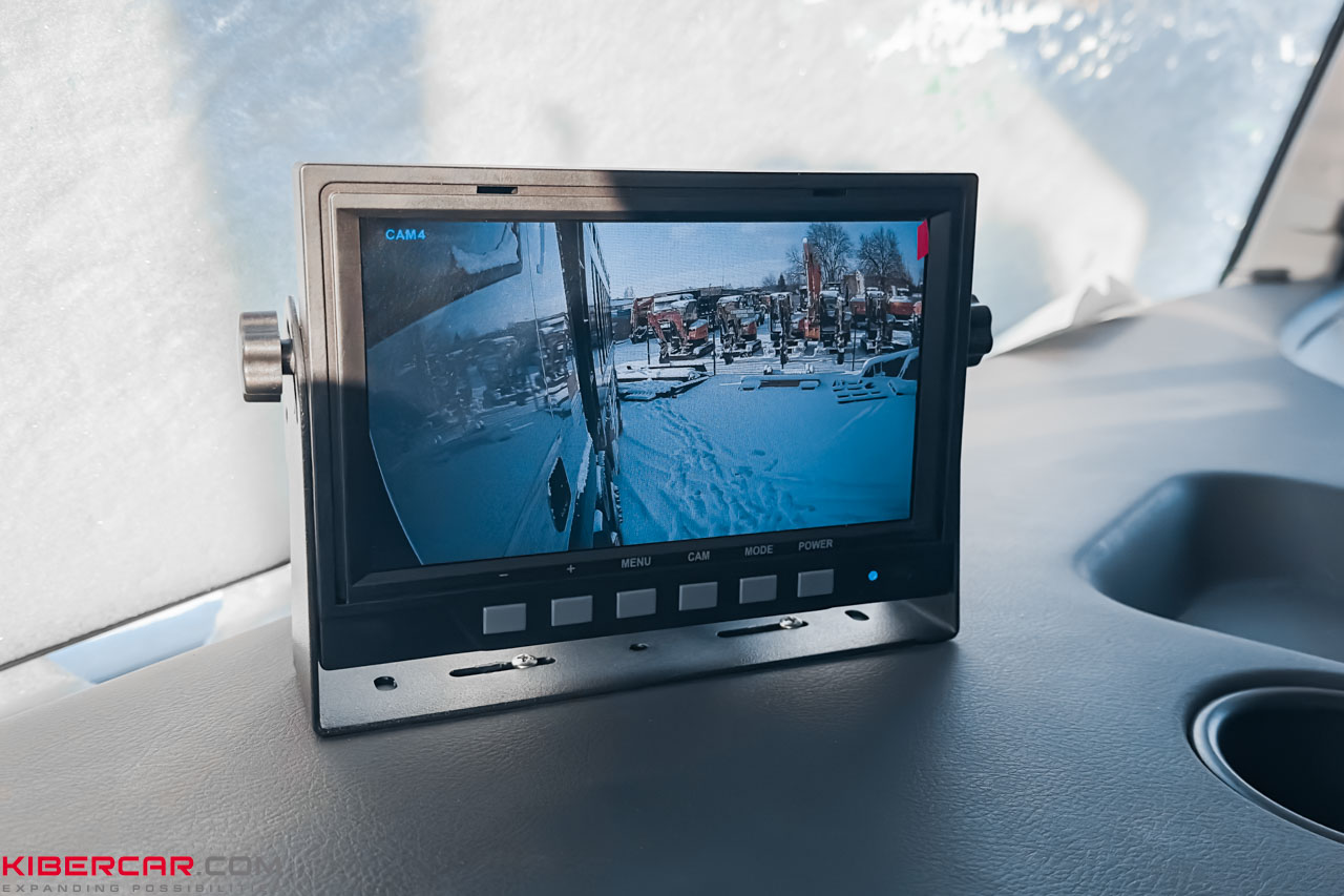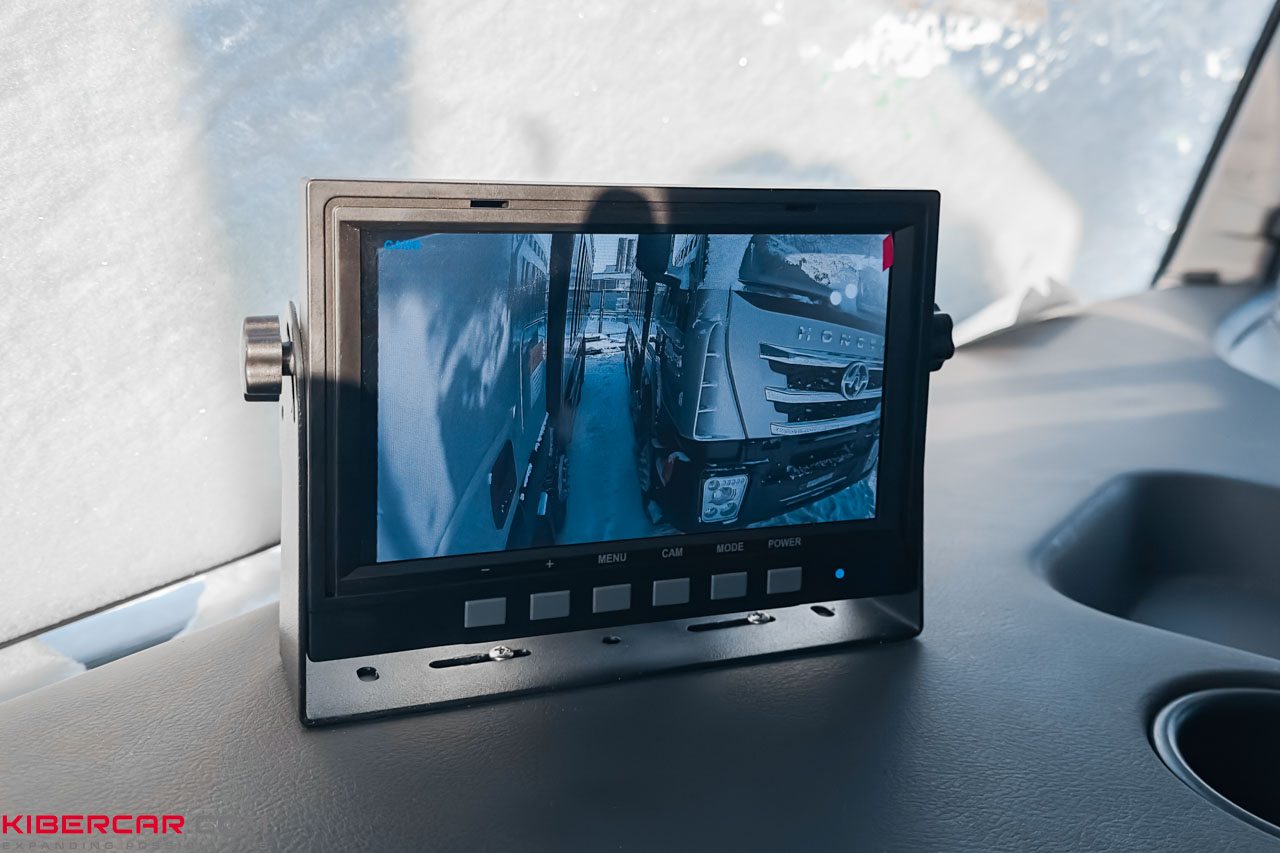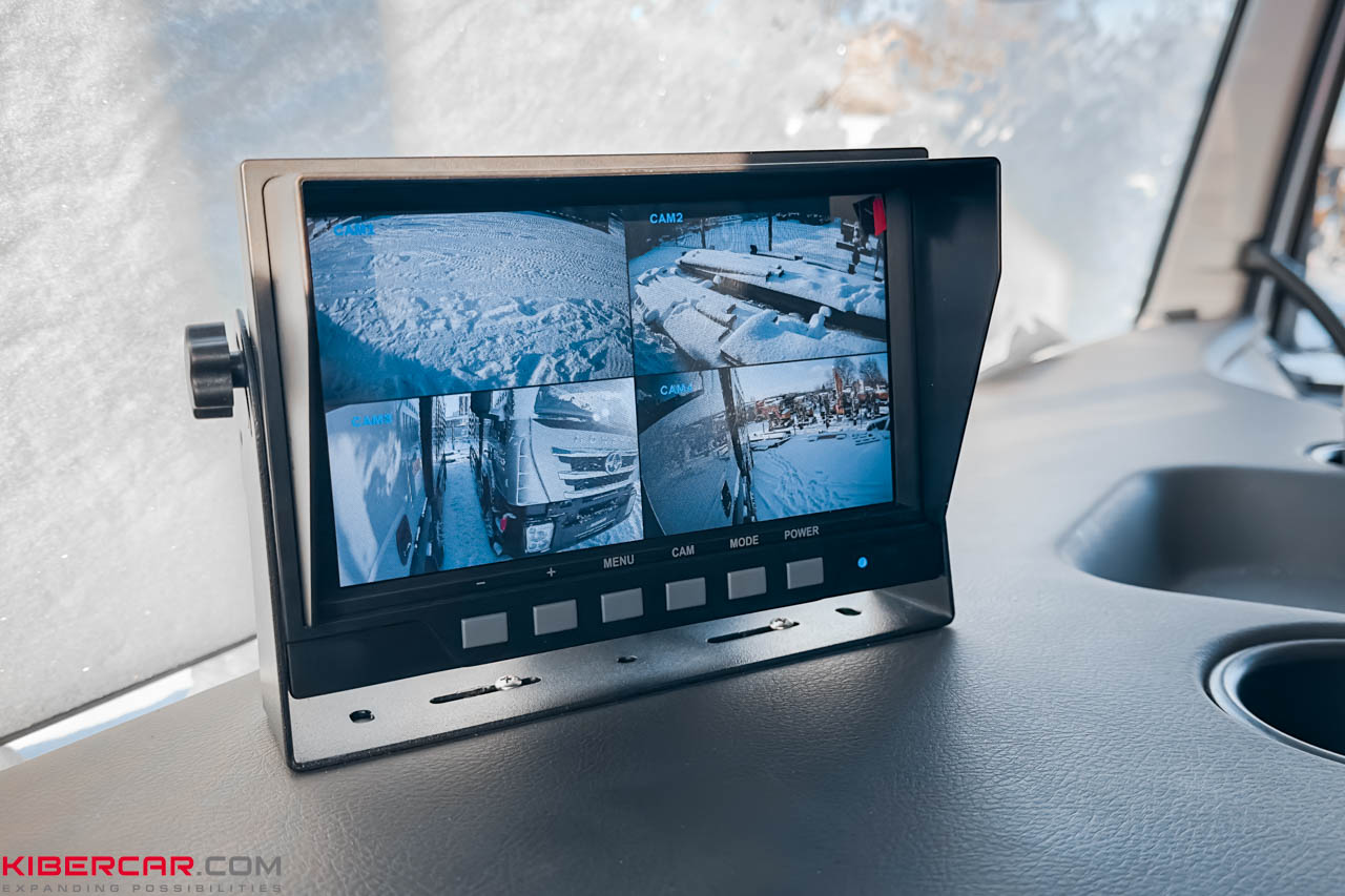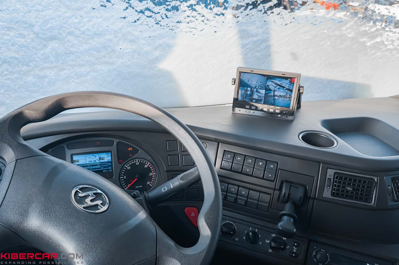 В кабине самосвала мы установили специальный монитор, на который и передается картинка со всех камер новой системы кругового обзора. Управлять режимами отображения можно с помощью кнопок. При переключении на заднюю передачу система срабатывает автоматически, позволяя водителю моментально получить полное представление о наличии помех сзади.