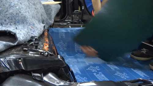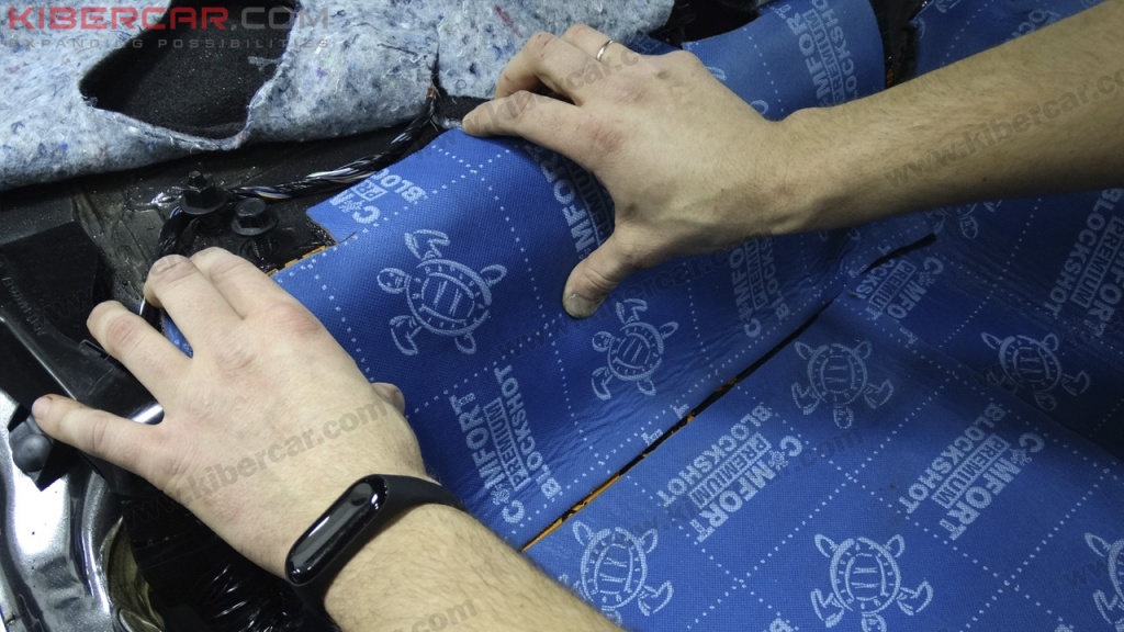 С монтированием третьего слоя проблем не возникло, благодаря пластичности материала и высокой антиадгезионной эффективности, «блокатор» прильнул к шумке как влитой, повторяя каждый контур автомобиля и предыдущих слоев.