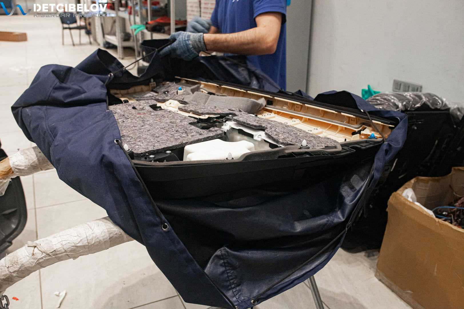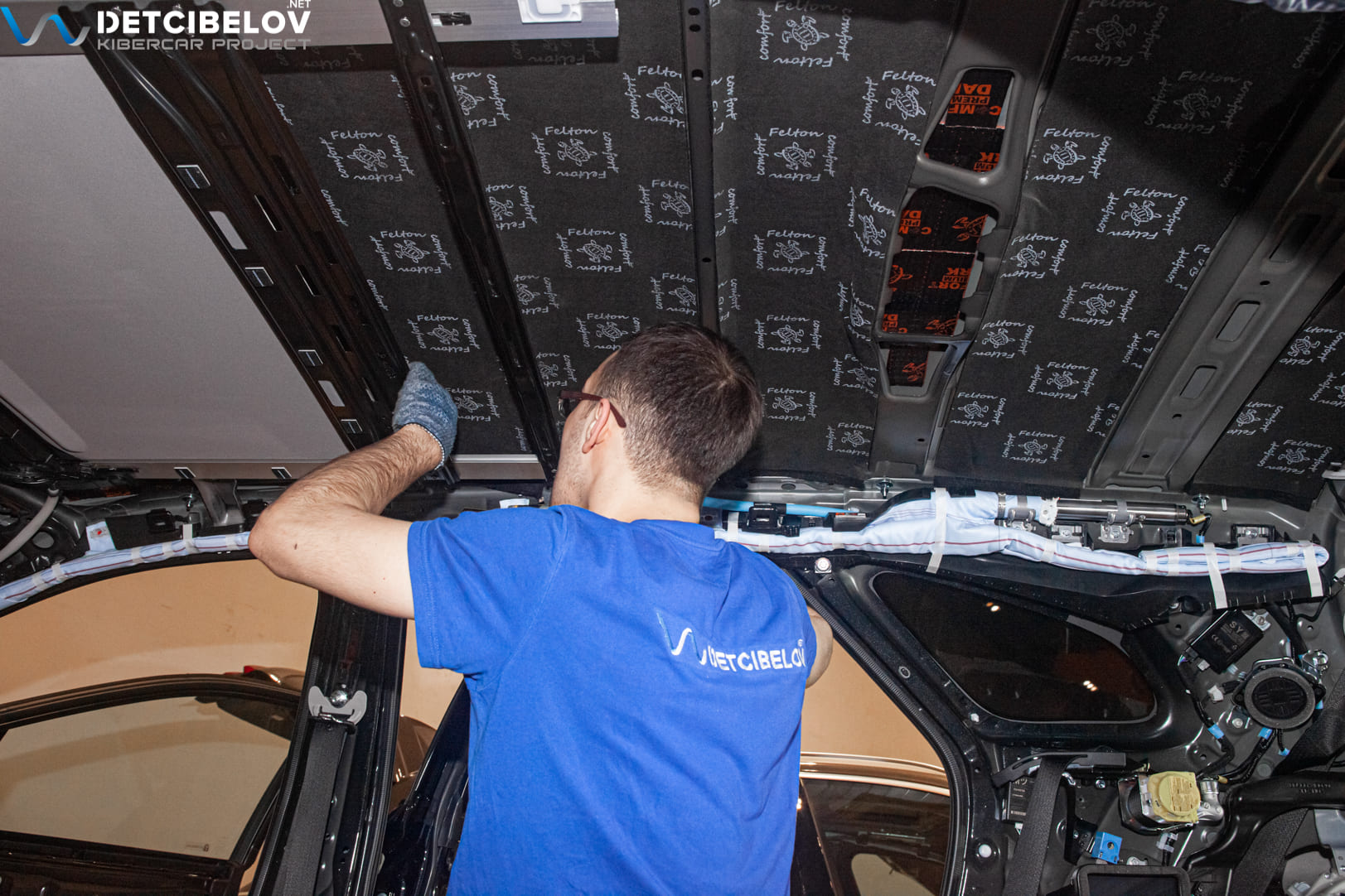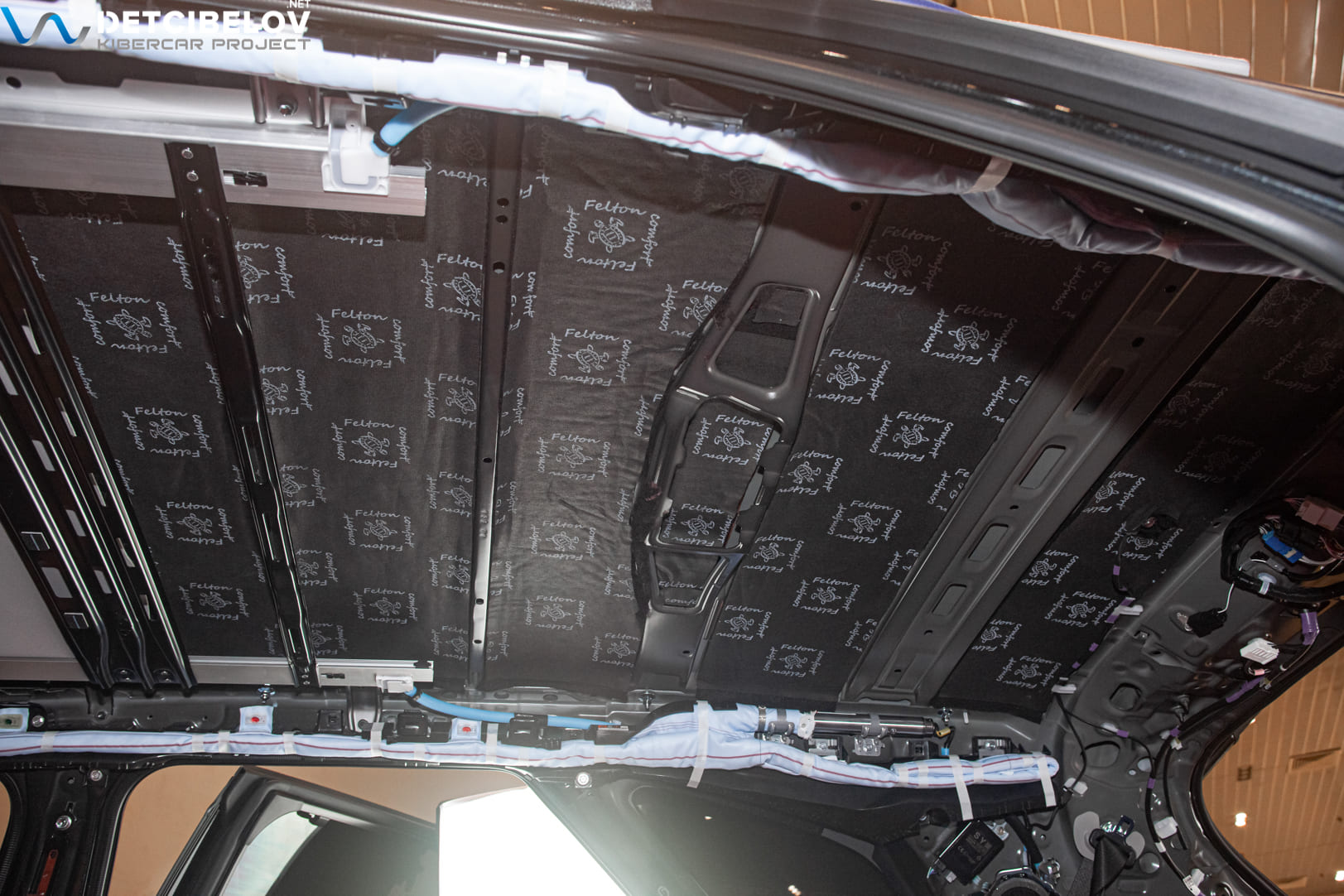 Следующий этап – шумоизоляция крыши. Максимально аккуратно чистыми одноразовыми перчатками демонтируем потолочную обшивку и обезжириваем поверхность потолка. После предварительной подготовки приступаем к шумоизоляции.