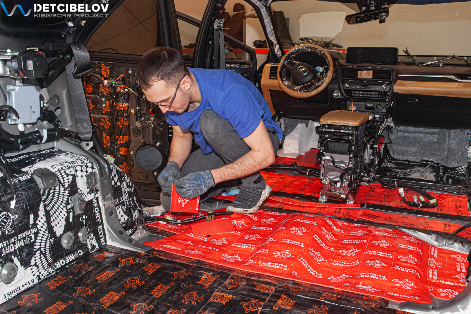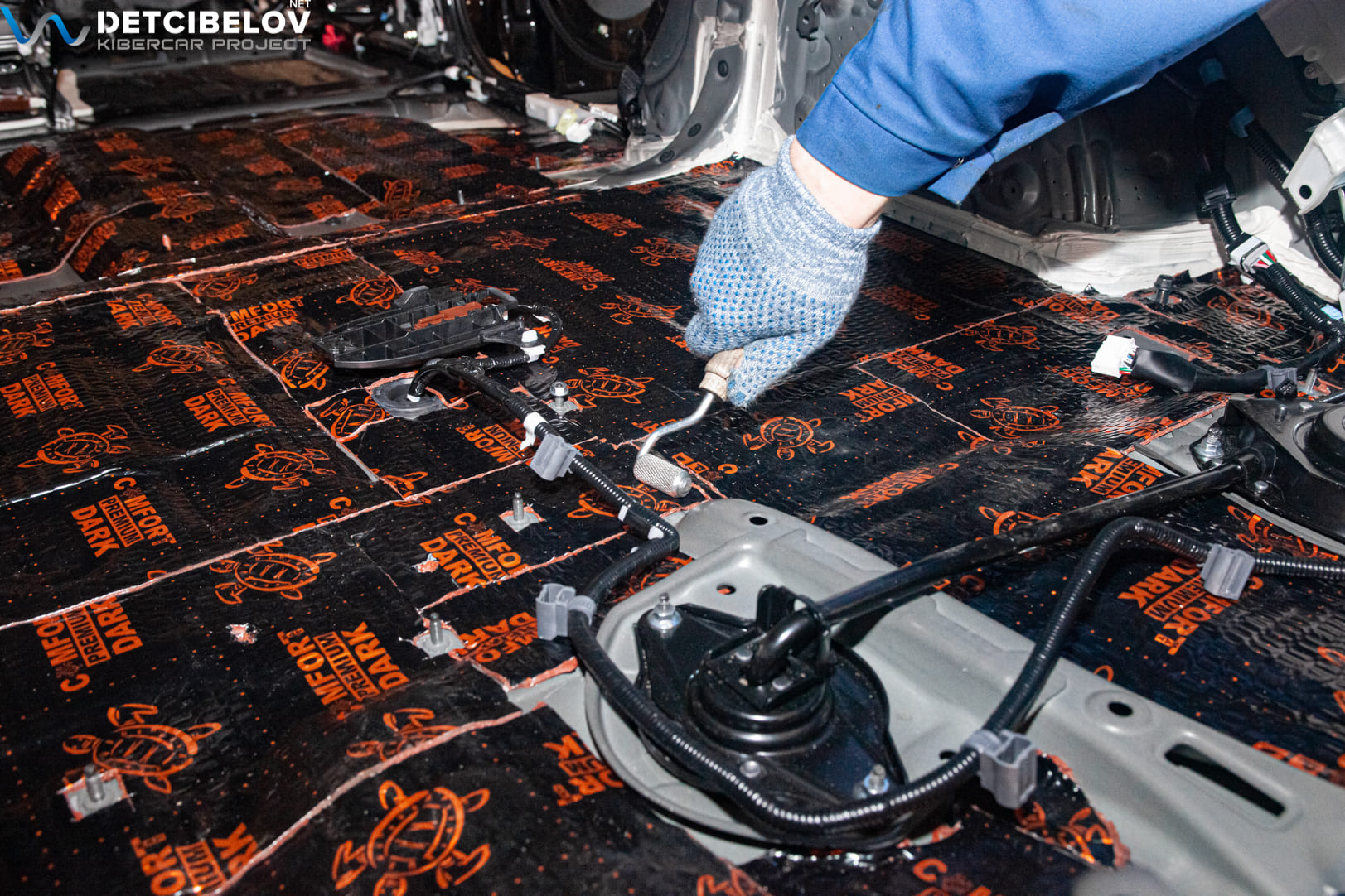 Далее приступаем к самой ответственной части шумоизоляции автомобиля – пола, багажника и внутренних колесных арок. Данный этап начинается с полного демонтажа сидений, ковров, обшивок и т.д. – ничего не должно мешать проводимым работам.