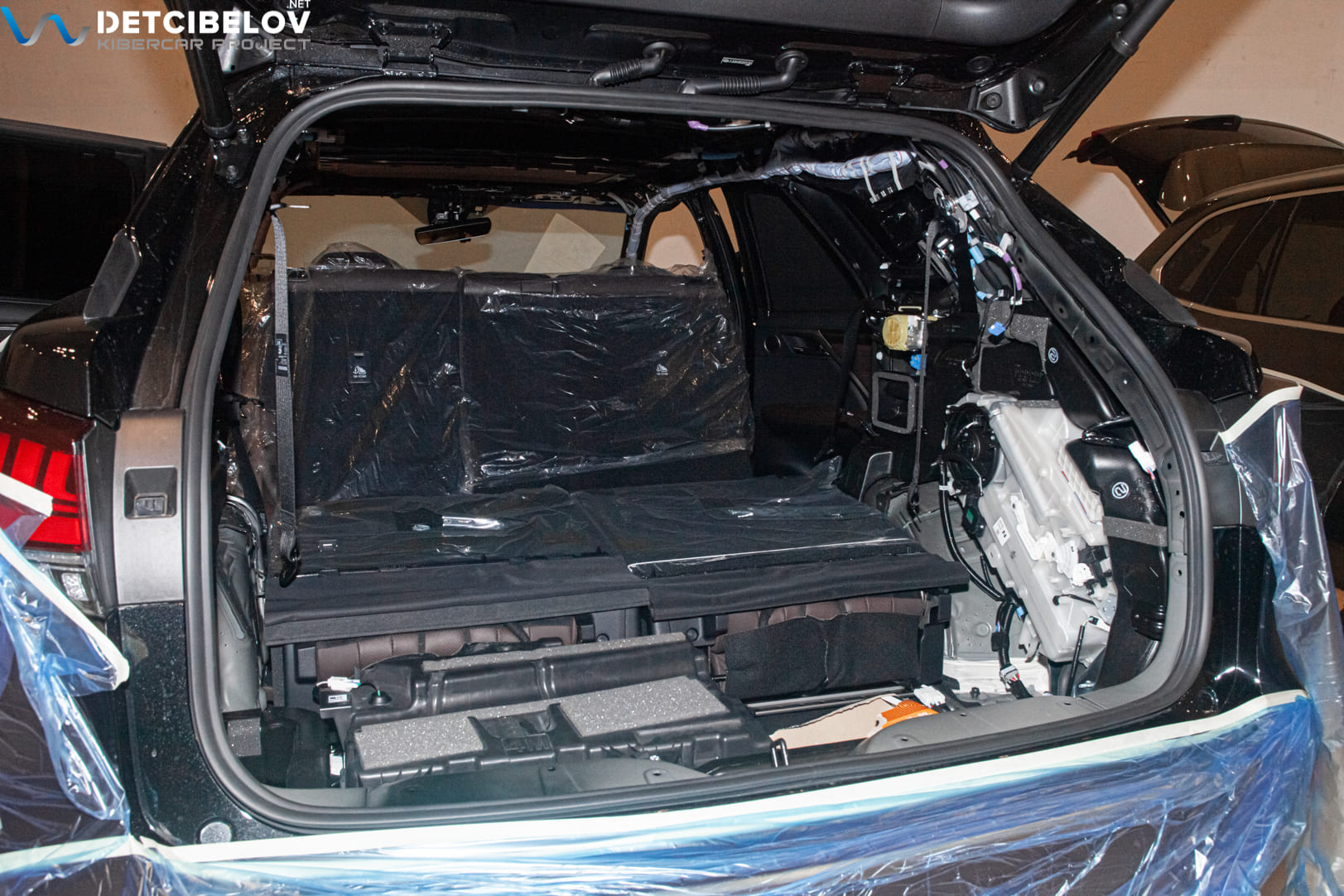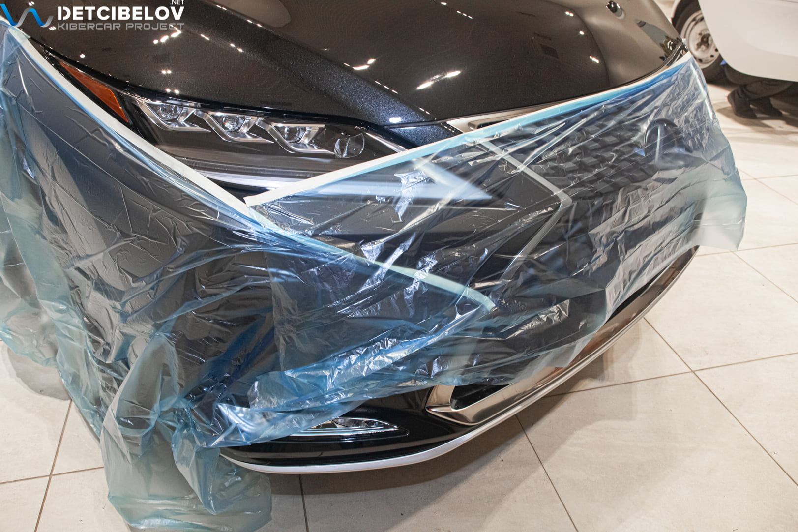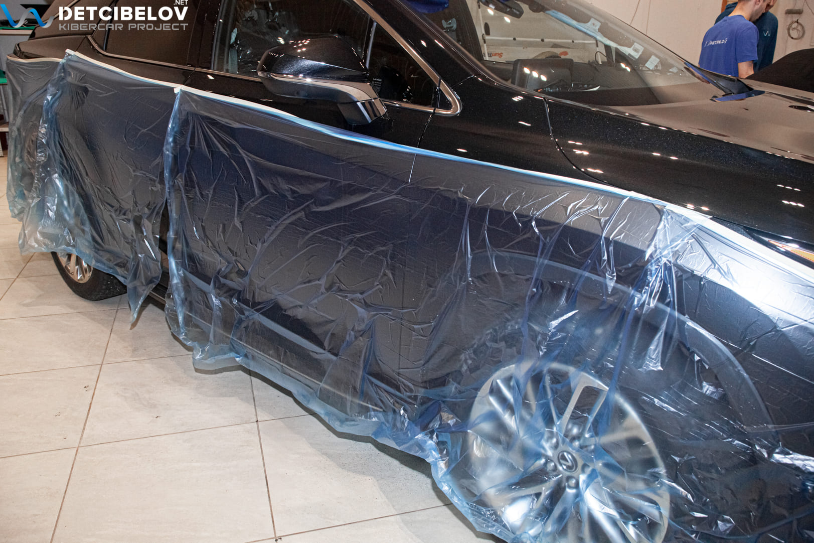 Приступаем к работе. Первым делом максимально защищаем автомобиль: оклеиваем пленкой все внешние элементы автомобиля, затем наносим скотч на пороги и арки дверей, упаковываем все мелкие пластиковые элементы в стретч-пленку. Сиденья и карты дверей помещаем в специальные чехлы.