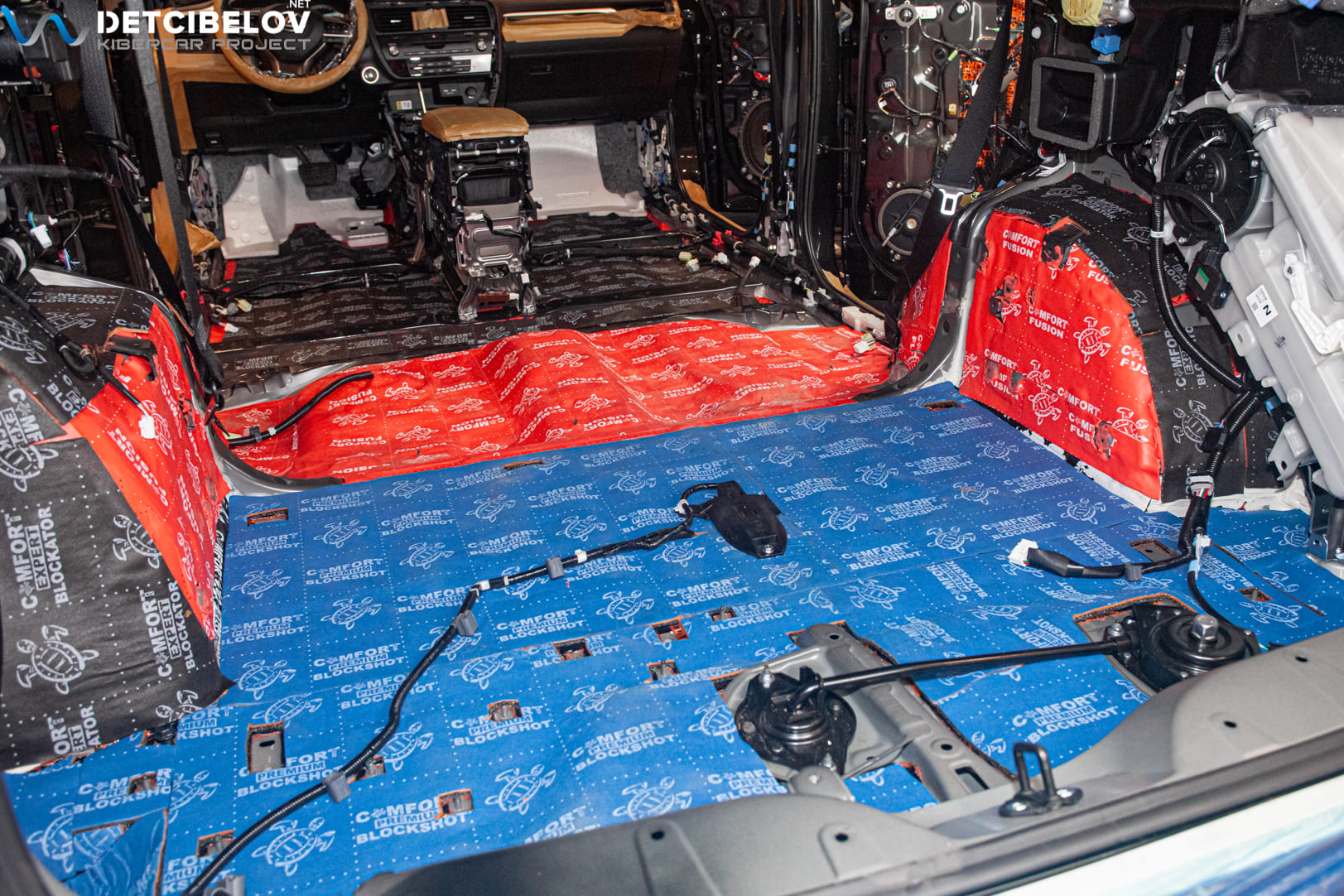 В итоге получился 4-х слойный пирог из мощнейшего вибродемпфера Comfort mat Extreme 3.5 с двумя слоями фольги, Comfort mat Blockator, Comfort mat Blockshot, а также возвращенной обратно штатной войлочной шумоизоляцией. Эта комбинация дает потрясающий результат и соответствует высоким стандартам шумоизоляции автомобилей.