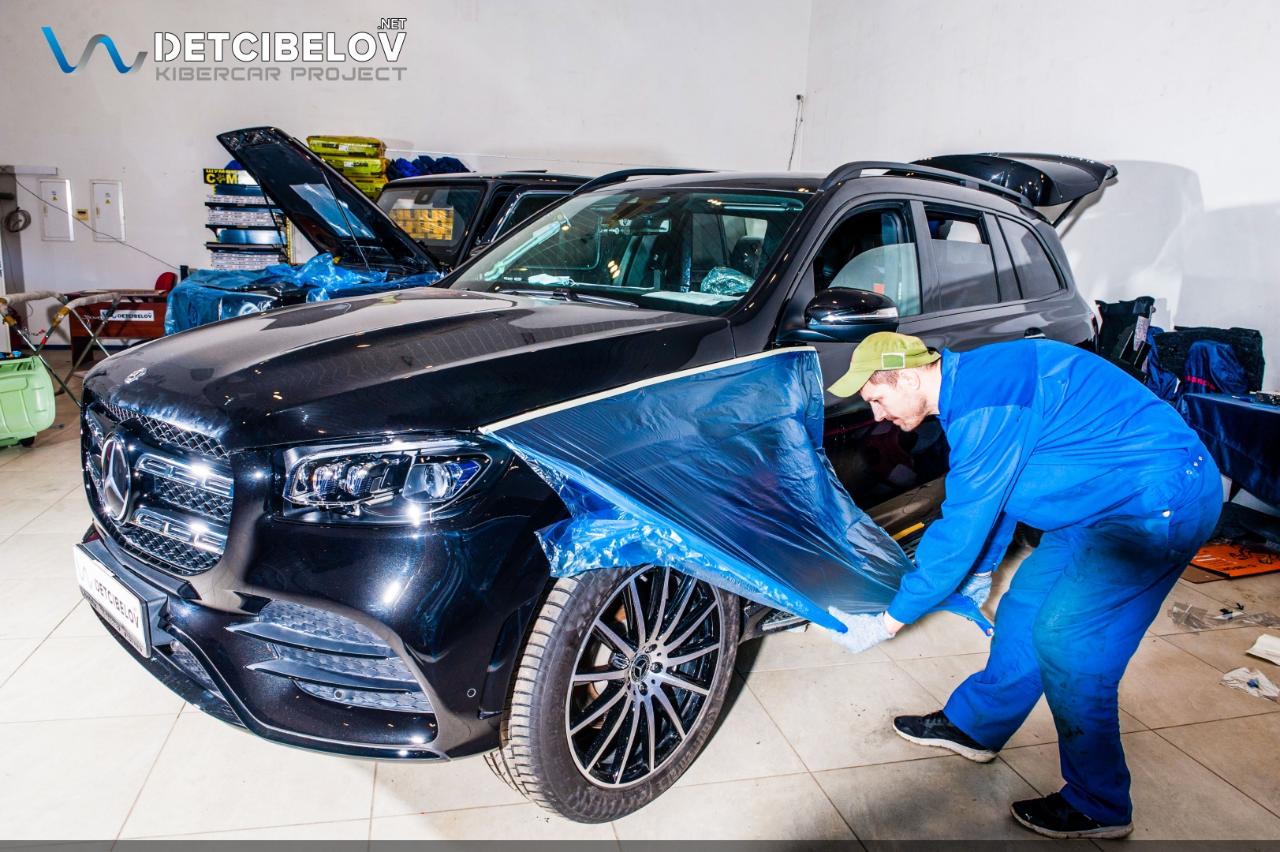 Приступаем к работе. Первым делом максимально защищаем автомобиль: оклеиваем пленкой все внешние элементы автомобиля, затем наносим скотч на пороги и арки дверей, упаковываем все мелкие пластиковые элементы в стретч-пленку. Сиденья и карты дверей помещаем в специальные чехлы.