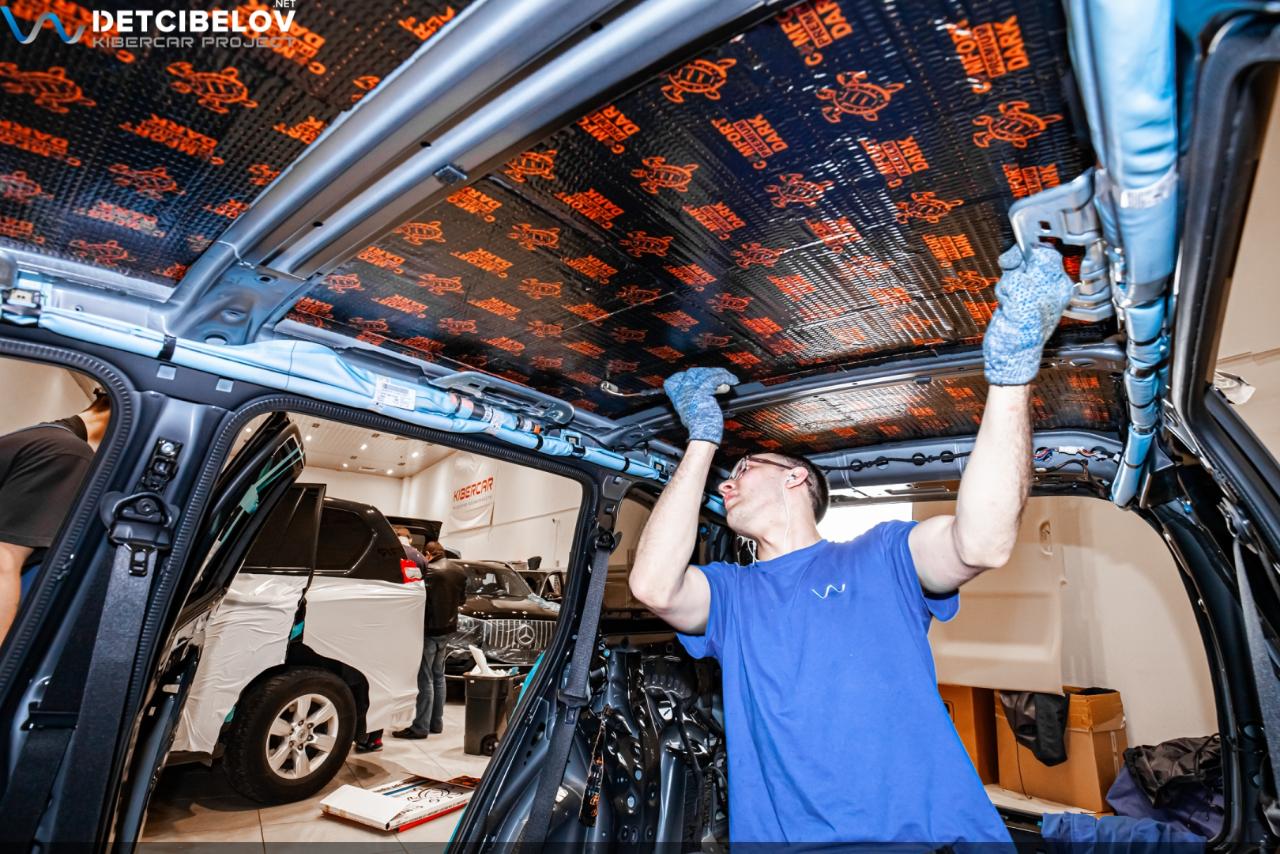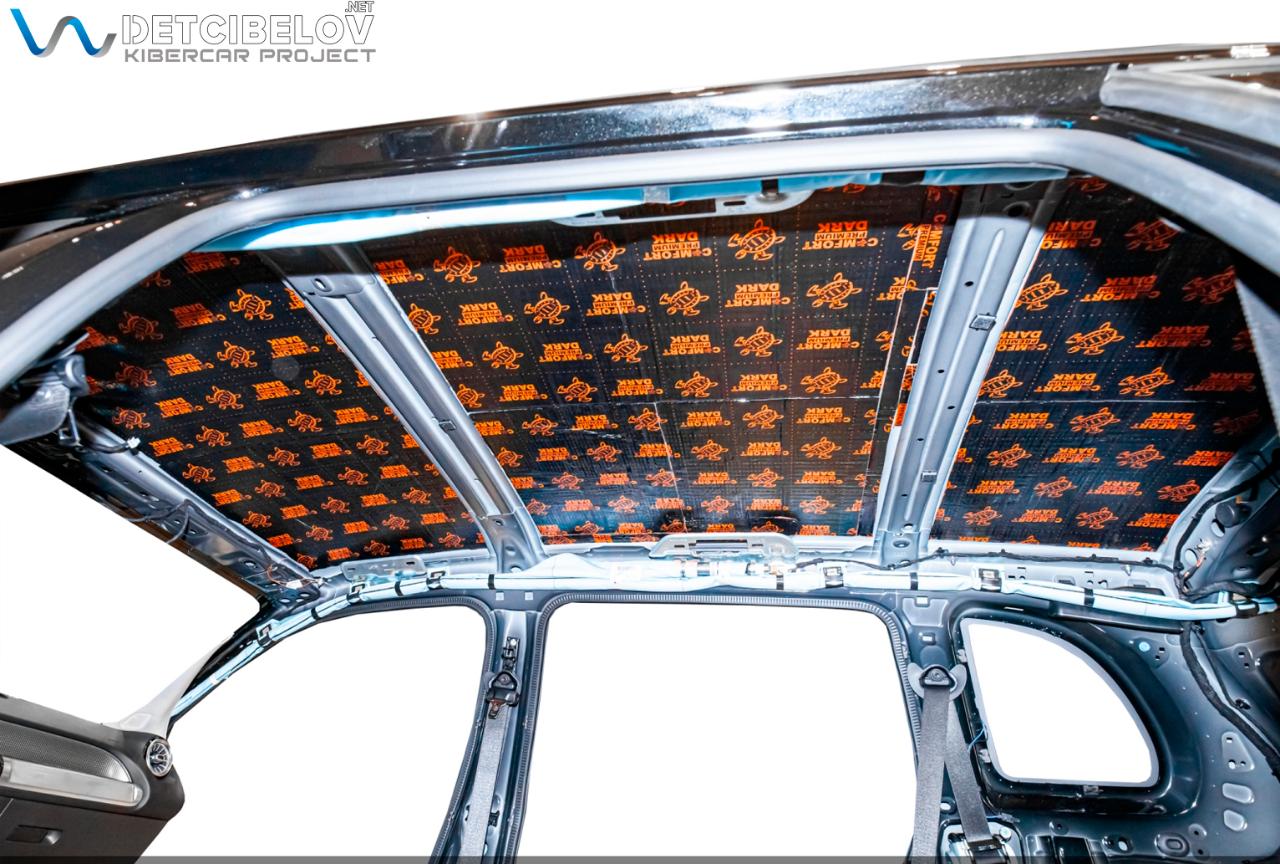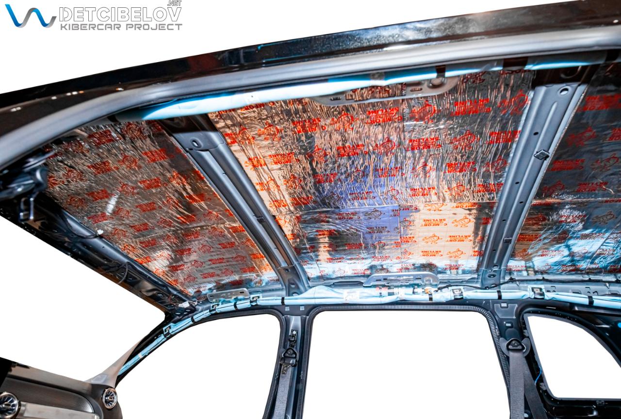 Затем приступаем к шумоизоляции потолка. Максимально аккуратно, чистыми одноразовыми перчатками демонтируем потолочную обшивку. После обезжиривания поверхности потолка начинаем монтаж виброизолятора Comfort mat Dark D3 Premium, , а затем шумопоглотитель Comfortmat SkyLine — это легкая мембранная звукоизоляция, рабочая часть этого шумоизоляционного материала состоит из шумоизоляционной прослойки, накрытой плотной тонкой звукоизоляционной мембраной.
