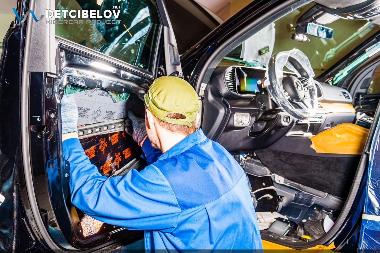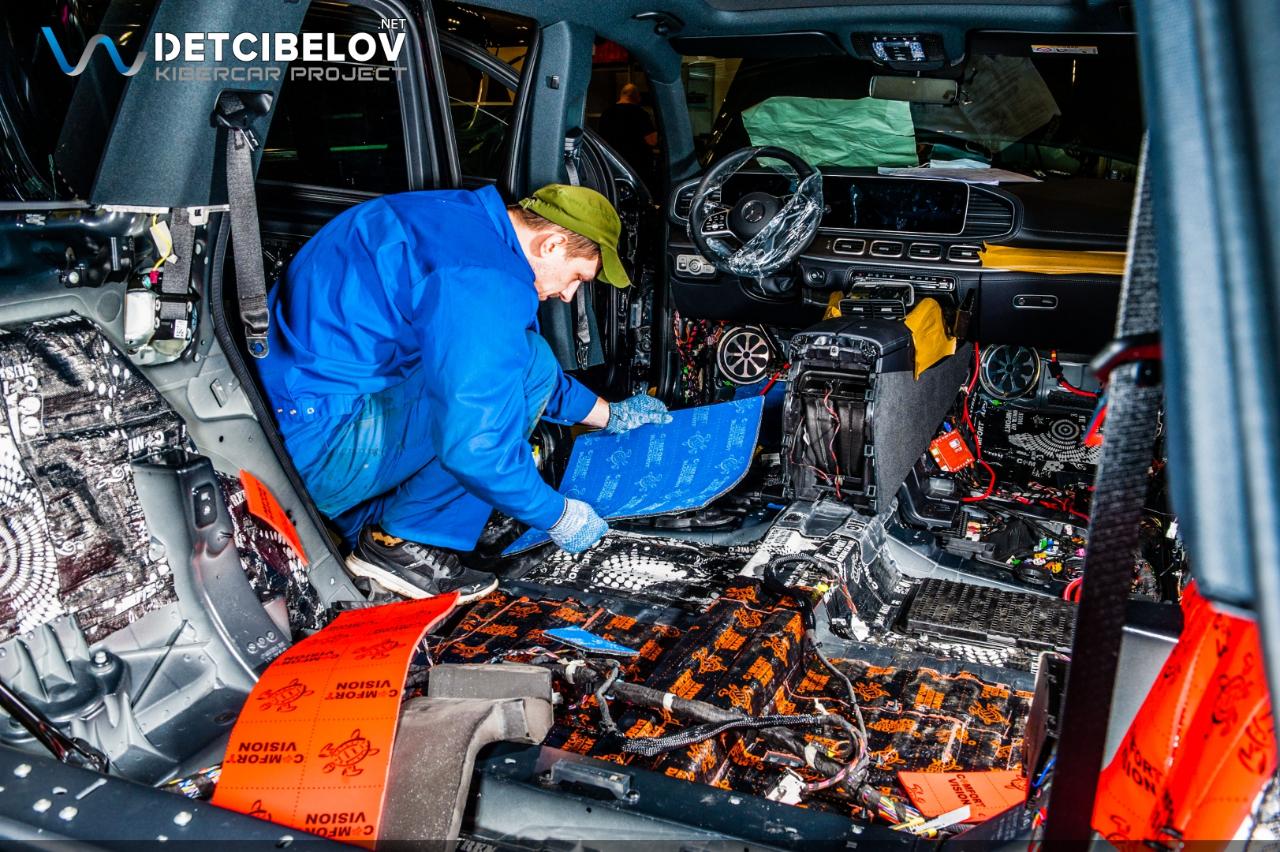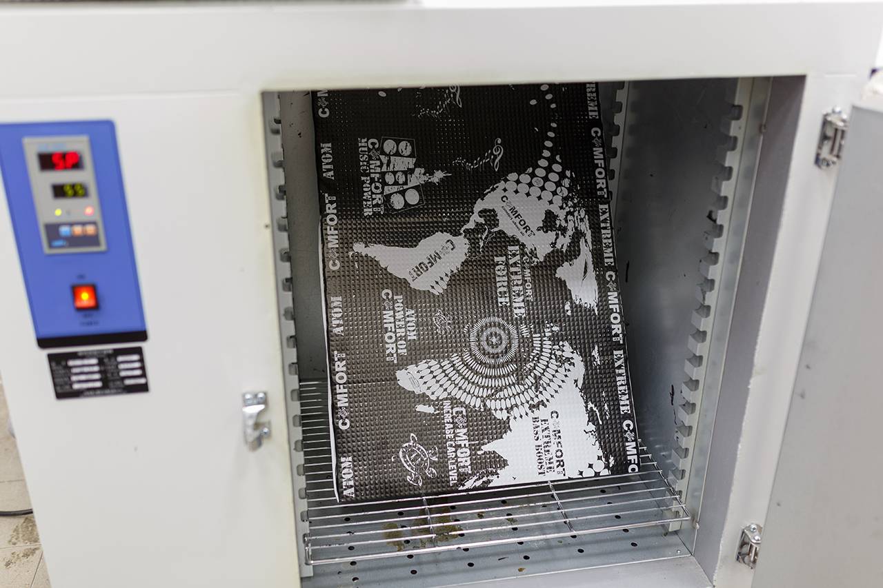 Для виброизоляции пола мы используем вибродемпфер Comfort mat Extreme 3.5 — это мастичнобитумный сэндвич с рекордной толщиной 3,5 мм и двумя слоями фольги, которые убирают низкочастотные структурные шумы металла. Это «Царь» среди виброизоляционных материалов с уникальной структурой мастики и лучшими показателями снижения вибрации. Нагреваем его при температуре 60-80 градусов в специальной печи – это обязательное условие, иначе качественно нанести этот материал не удастся. Его мы используем на полу и на задних колесных арках.