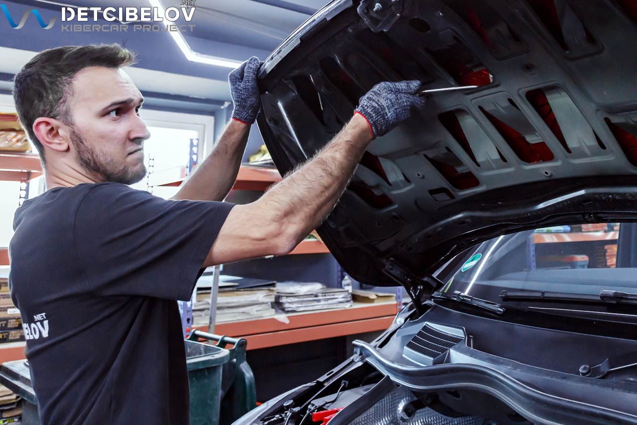 Для начала мы подготовили автомобиль: все внешние элементы оклеили пленкой, убрали лишнее из салона. Работы проводили в чистом помещении, команда использовала защитную одежду и перчатки – все для того, чтобы не оставить следов.