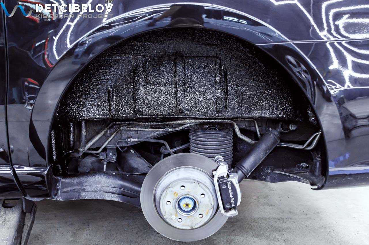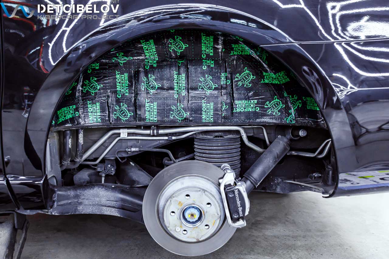 Работа была бы неполной, если бы мы не обесшумили колесные арки. После демонтажа подкрылков мы нанесли на арки вибродемпфер Comfort mat Extreme 3.5, а швы обработали напыляемым полимером.