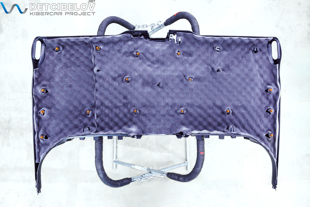 На внутреннюю поверхность капота клеим материал Aerocell QP Genio (4 мм). Одного слоя достаточно, чтобы уменьшить вибрации и шум от работающего двигателя. А на крышке багажника используем двухслойную конструкцию: помимо того же Aerocell QP Genio (4 мм), вторым слоем клеим Comfort mat Wave Expert (15 мм) для дополнительного шумопоглощения.