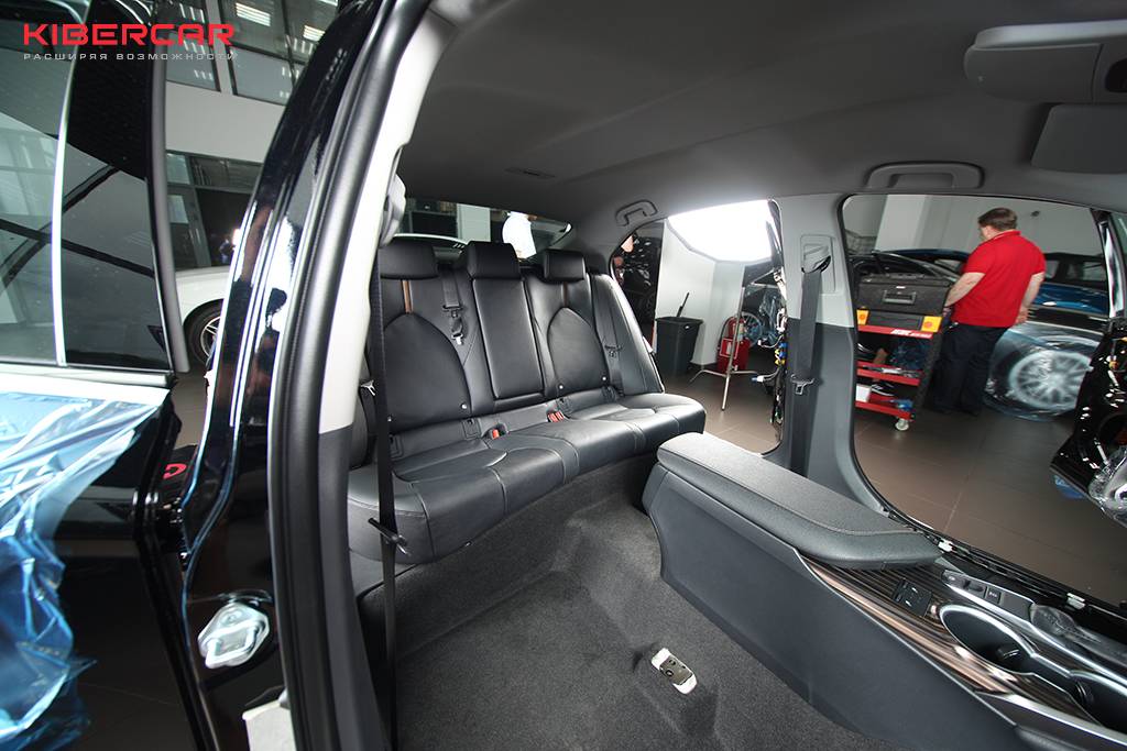 Затем приступаем к шумоизоляции потолка. Максимально аккуратно, чистыми одноразовыми перчатками демонтируем потолочную обшивку. После обезжиривания повернхности потолка начинаем монтаж виброизолятора Comfort mat Dark D3 Premium, а затем шумопоглотитель Comfortmat SkyLine — это легкая мембранная звукоизоляция, рабочая часть этого шумоизоляционного материала состоит из шумоизоляционной прослойки, накрытой плотной тонкой звукоизоляционной мембраной. Финальный алюминизированный слой позволяет нам получить высокую адгезию для следующего третьего слоя шумоизоляии потолка Toyota Camry, им будет пенополиуретановая пенорезина Comfort mat Wave Expert 15мм.