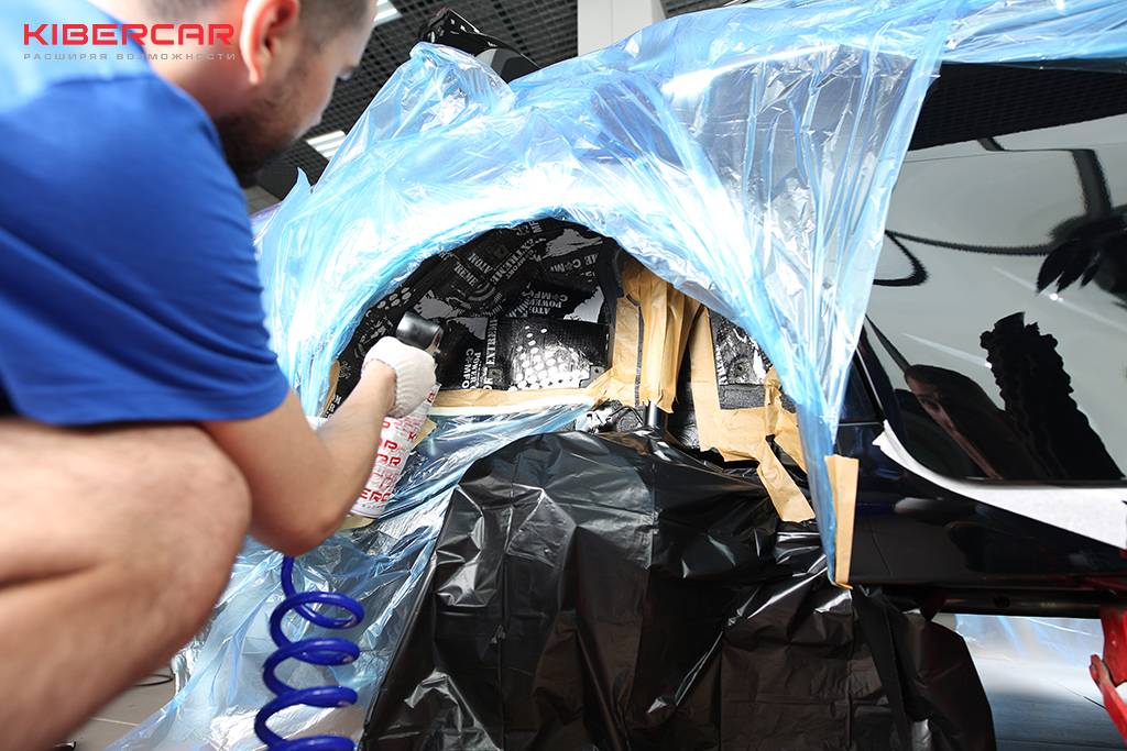Приступаем к работе. Первым делом максимально защищаем автомобиль: оклеиваем пленкой все внешние элементы автомобиля, затем наносим скот на пороги и арки дверей, упаковываем все мелкие пластиковые элементы в стретч-пленку. Сиденья и карты дверей помещаем в специальные чехлы.