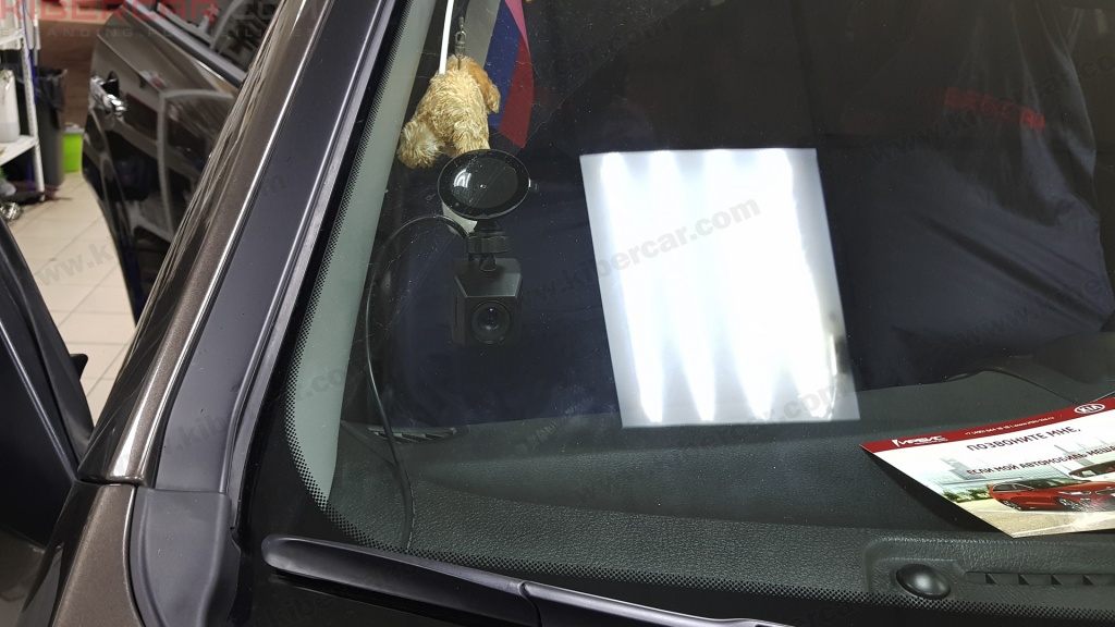 Камера, по аналогии с L200, была выведена в правую часть лобового стекла для лучшей видимости на мониторе, а провода от нее аккуратно залезают под обшивку.