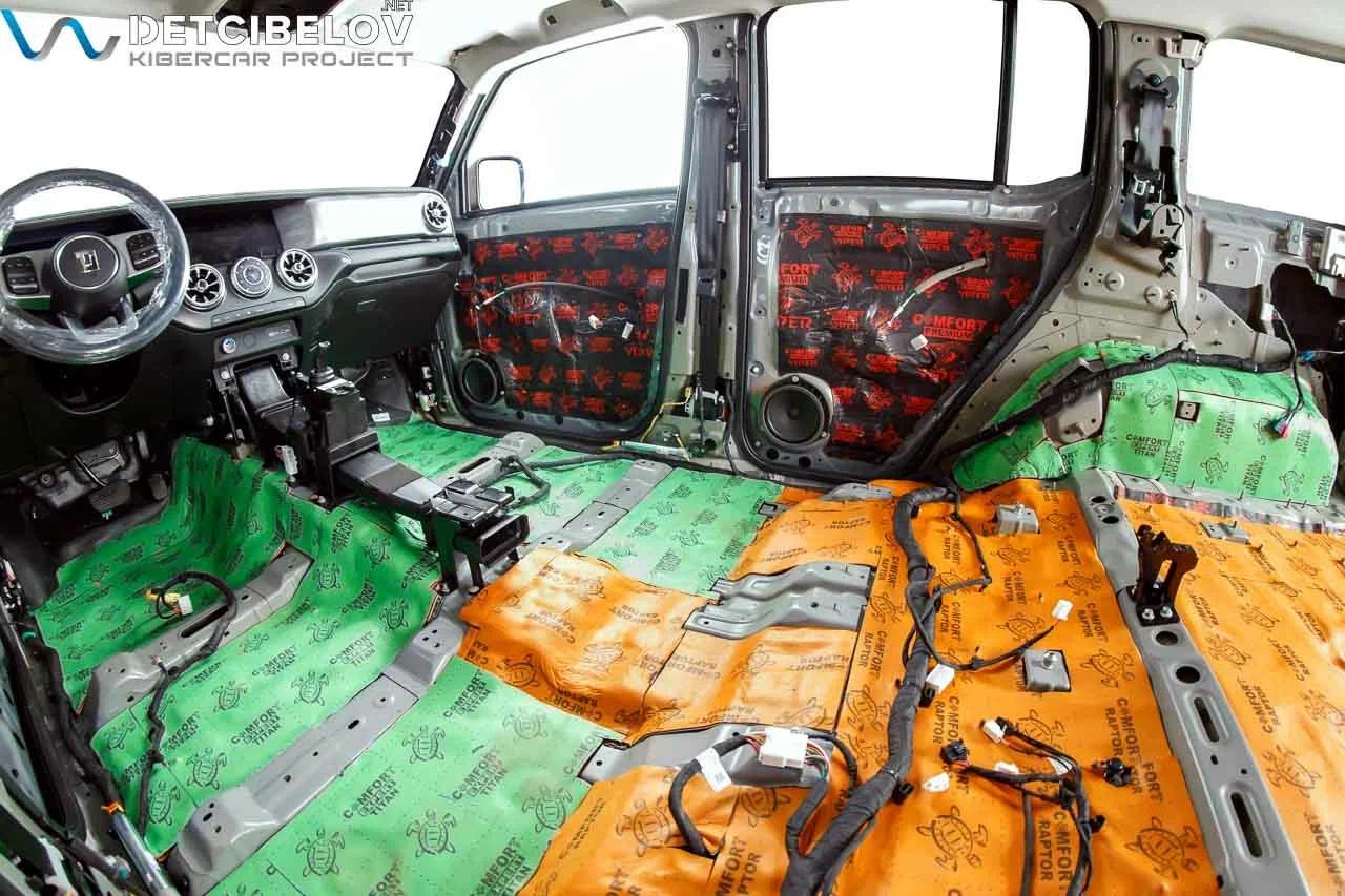Пожалуй, самым сложным было обесшумливание пола, так как на разных участках мы использовали разные материалы. В большей части салона и на внутренних арках использовали вибродемпфер Comfort mat Extreme, рассчитанный на экстремальные нагрузки. Он наносится после предварительного разогрева. Вторым слоем уложили многослойный Comfort mat Raptor. В нише багажника и на полу под задними сиденьями использовали уже знакомый вам Comfort mat Viper, а поверх него – эффективный звукоизолятор Comfort mat Titan.
