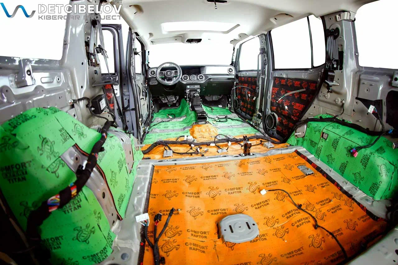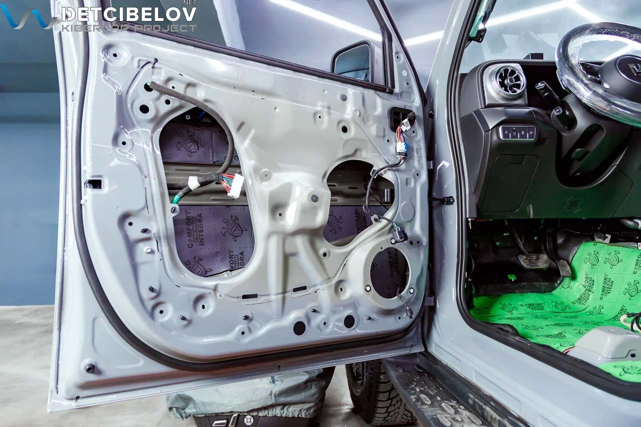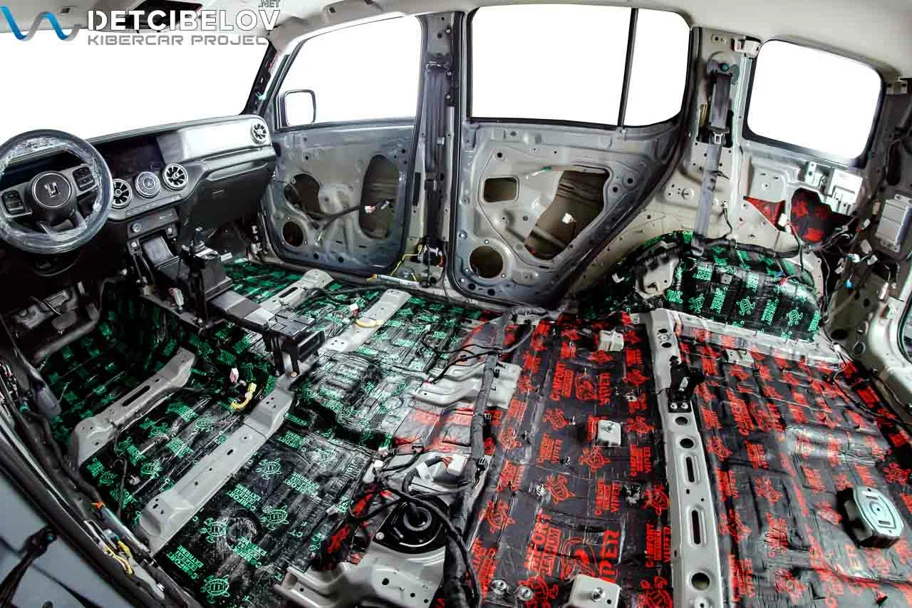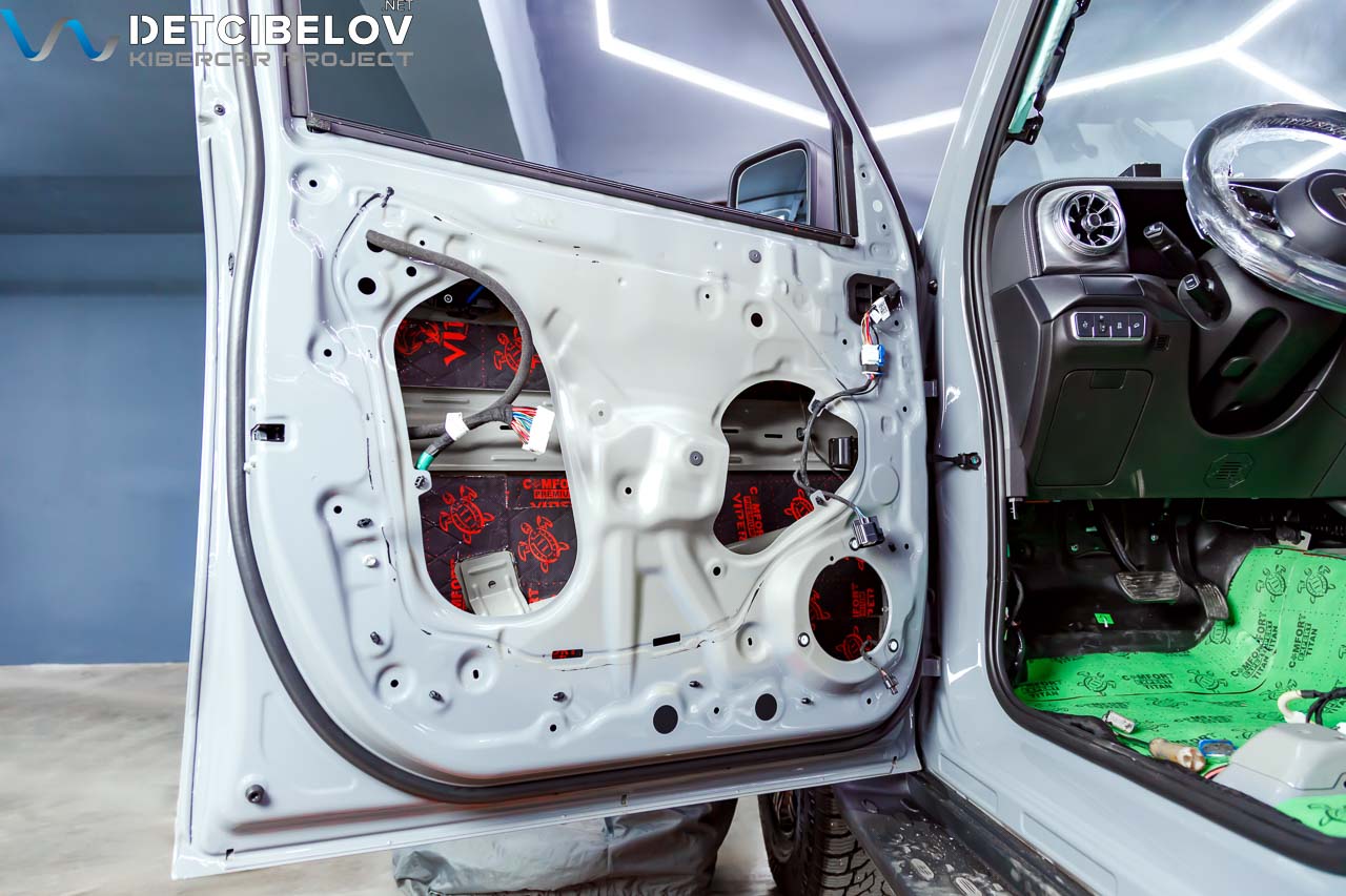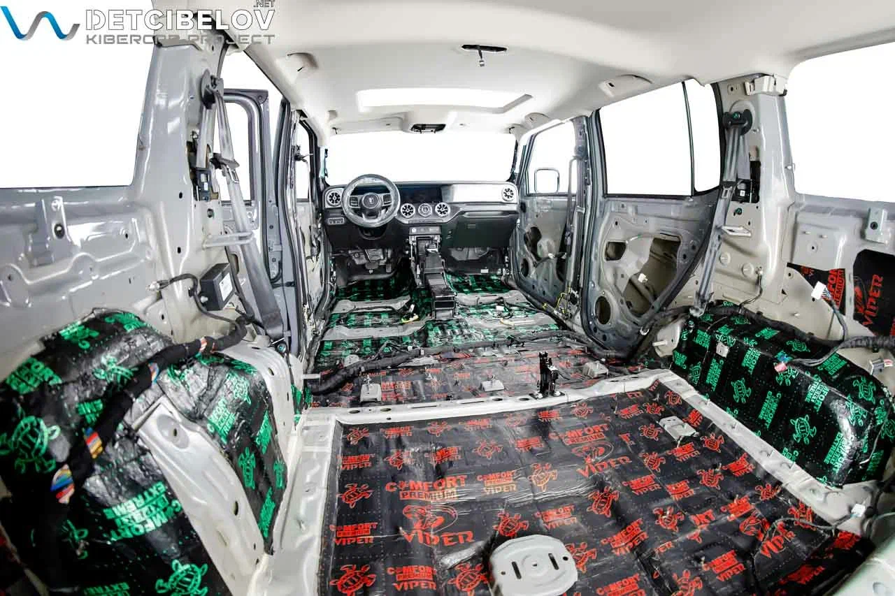 Штатная шумоизоляция Tank 300 – очень посредственного качества, поэтому нам часто приходится работать с этой моделью. Зато эффект от обесшумливания действительно впечатляет: в этот раз нам удалось снизить уровень шума в салоне в 11 раз. Для оценки результата использовали специальное акустическое оборудование.