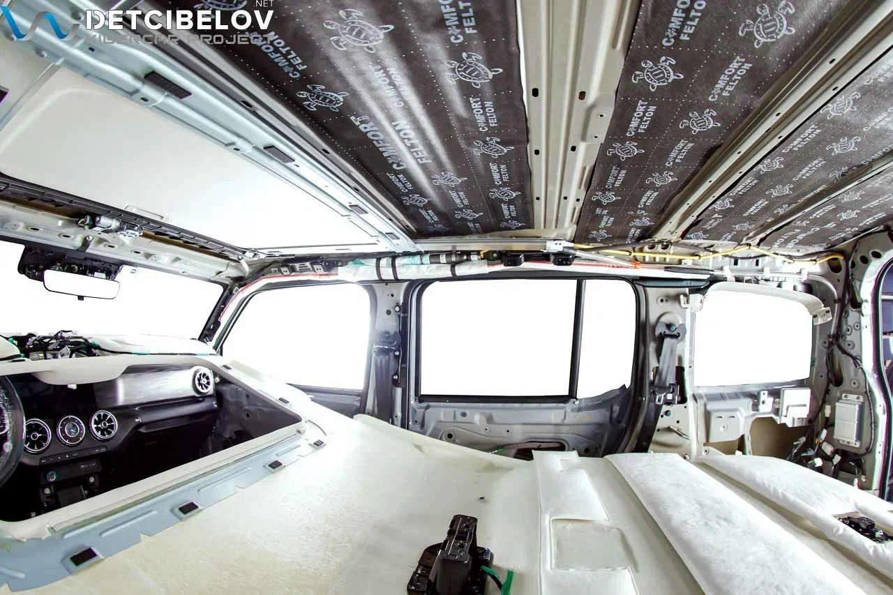На потолке мы установили два слоя материалов. Нижний слой выполнен из вибродемпфера Comfort mat Viper, поверх него установлен акустический войлок повышенной плотности Comfort mat Felton (10 мм). Обшивку так же аккуратно сняли и вернули на место после завершения обесшумливания.