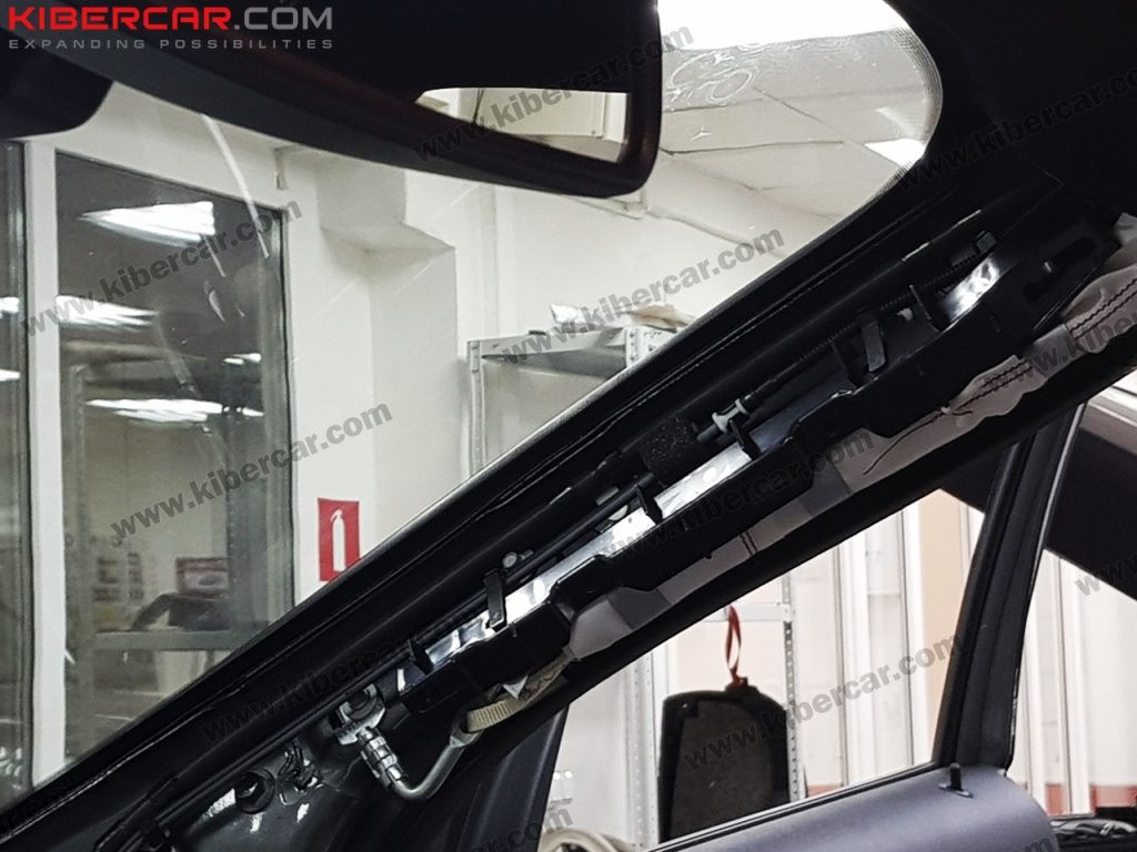 Часть проводки будет идти через правую стойку лобового стекла. Например, микрофон, для управления навигацией мы устанавливаем вблизи зеркала заднего вида, соответственно только через стойку лобового стекла мы сможем аккуратно спрятать не нужные элементы.