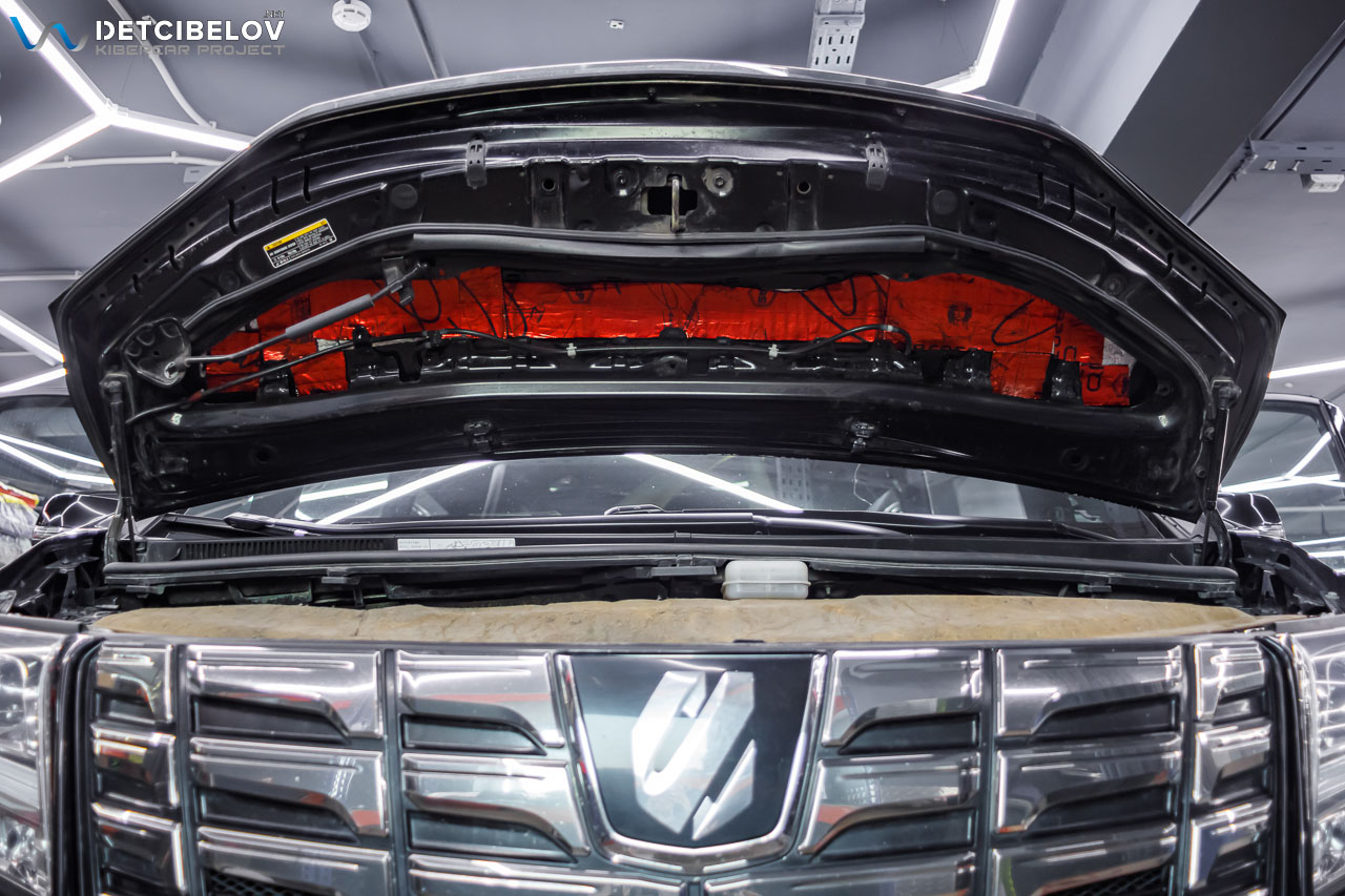 Шумоизоляция моторного отсека Toyota Alphard тоже оставляет желать лучшего: шум двигателя проникает в салон достаточно сильно. В этом проекте мы ограничились обработкой капота материалом Aerocell QP Genio (4 мм). Можно решить проблему еще радикальнее, выполнив дополнительно шумоизоляцию моторного щита. Эта опция доступна при заказе пакета Абсолютный Максимум «Капсула 360°».