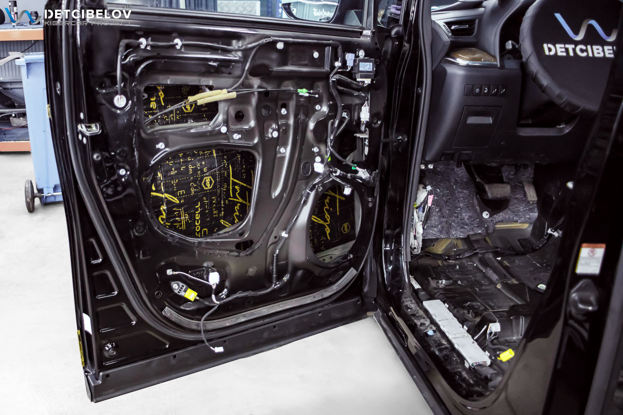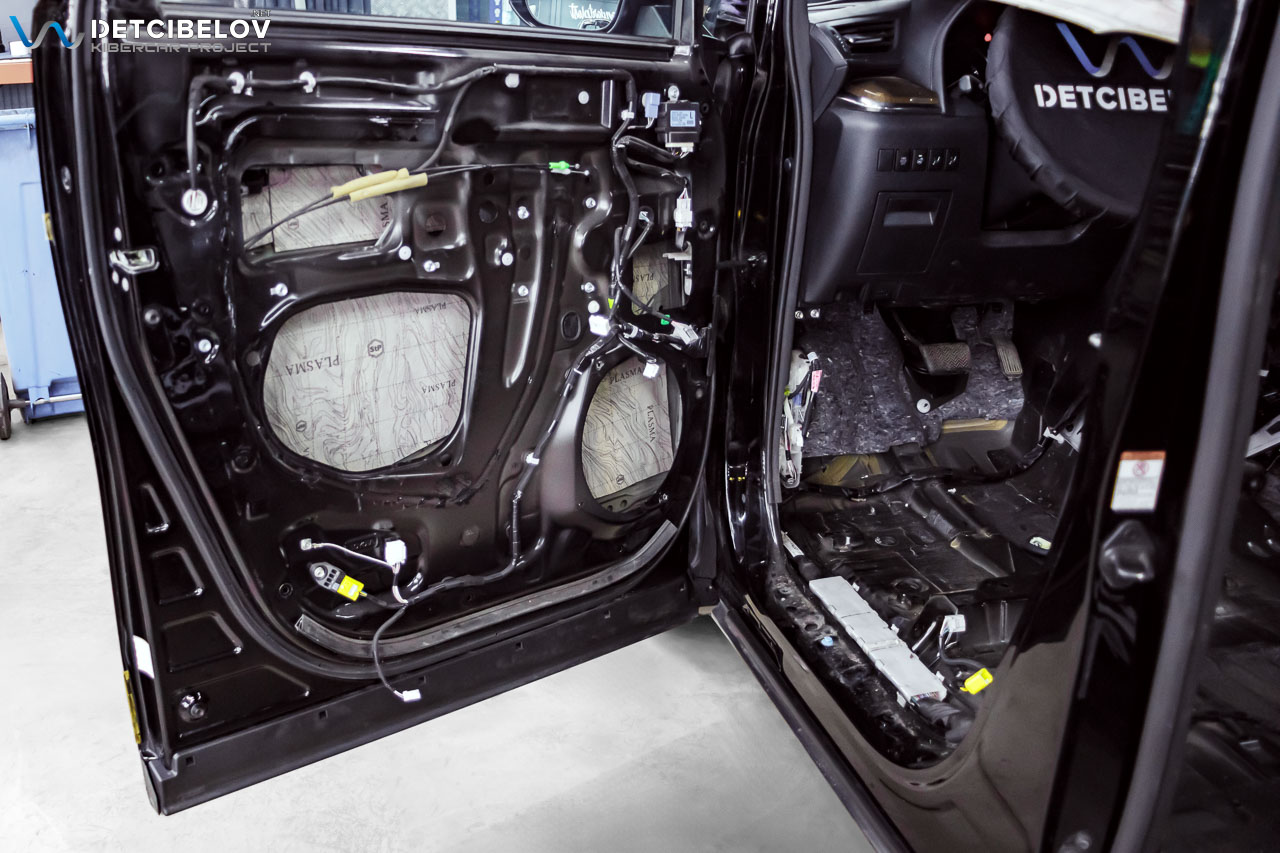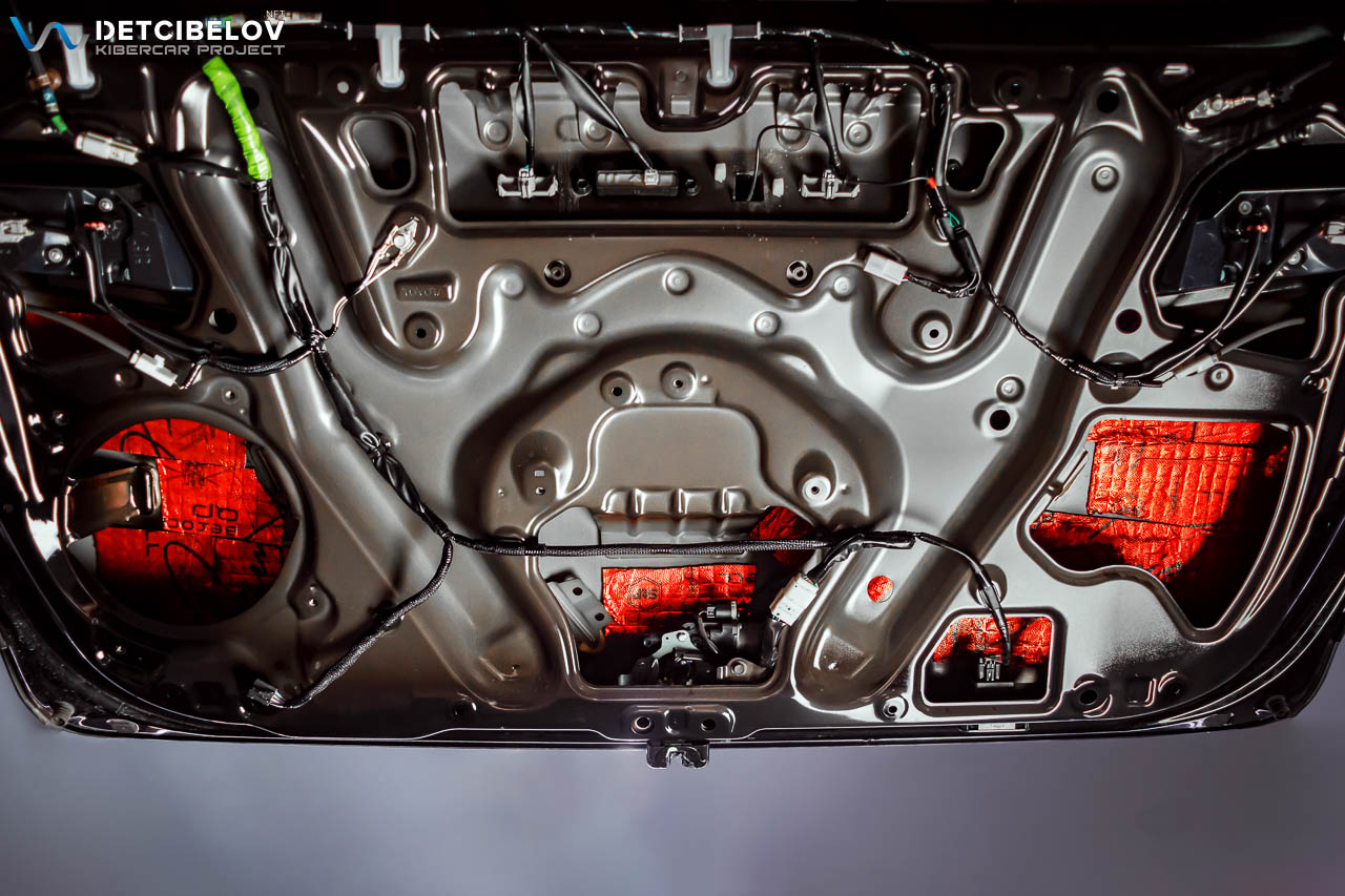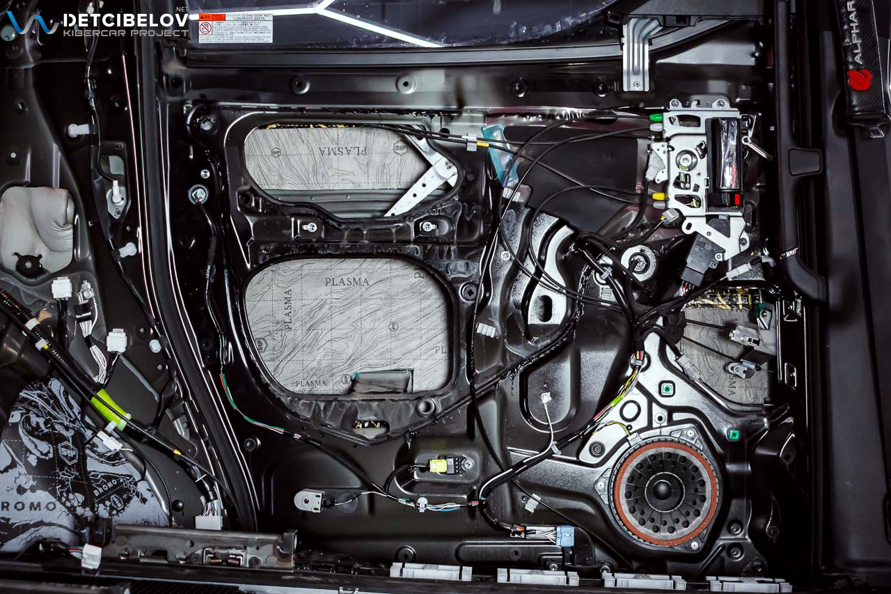 В дверях Toyota Alphard заводской шумки, по сути, нет. Из-за этого в салон проникает дорожный шум, а также вибрации от работающих динамиков. Так что мы разобрали обшивки, обезжирили металл и уложили два слоя: Aerocell QP Intrigo (6 мм), на основе полипропилена и гранул, и StP Plasma (4 мм), материал из вспененного полипропилена и мастичной мембраны.
