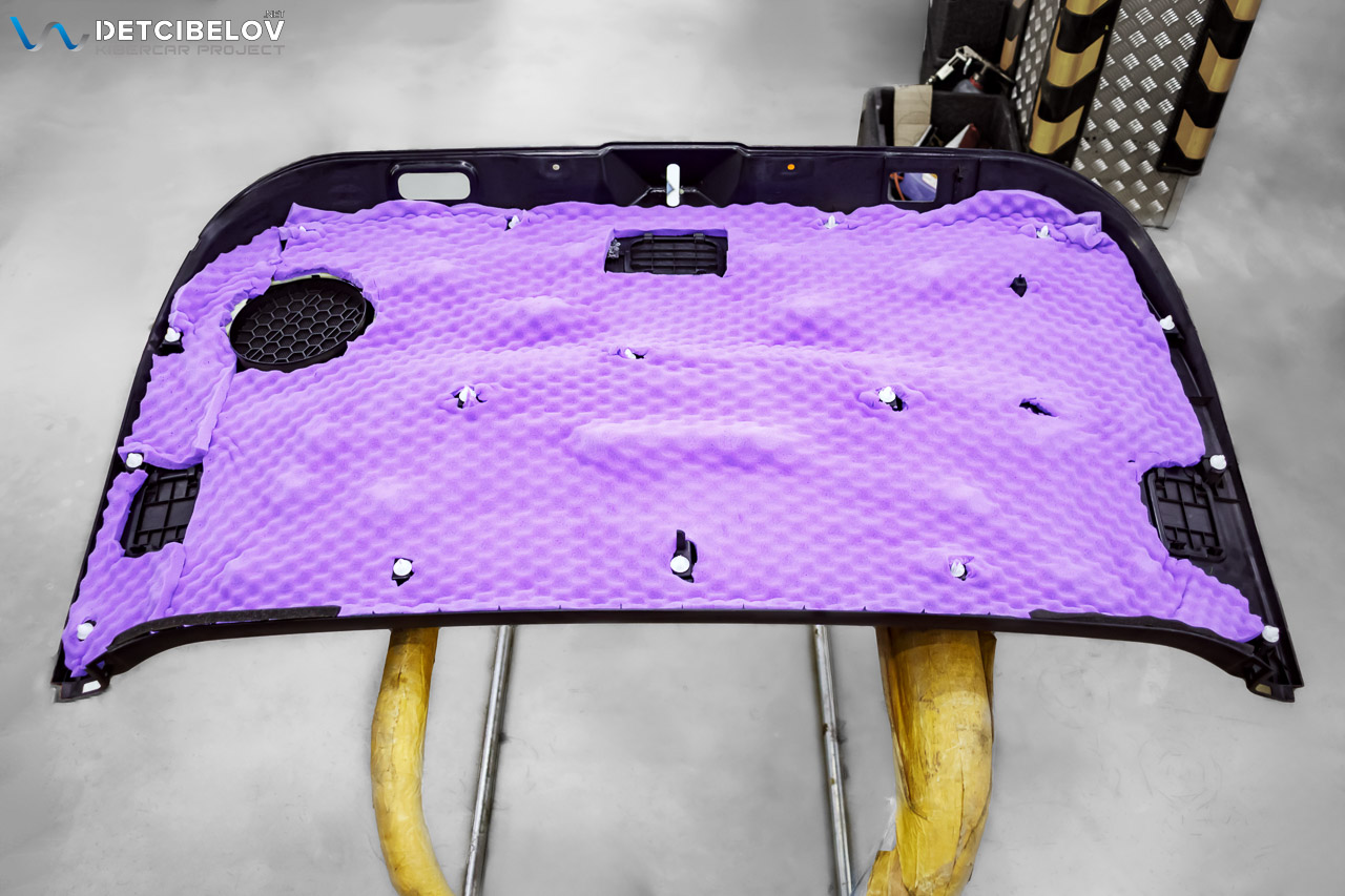 Крышка багажника тоже не имеет заводской шумки, что особенно заметно пассажирам третьего ряда. Мы обработали ее материалом Aerocell QP Genio (4 мм), а на пластиковую панель наклеили шумопоглотитель StP Biplast Premium (15 мм).