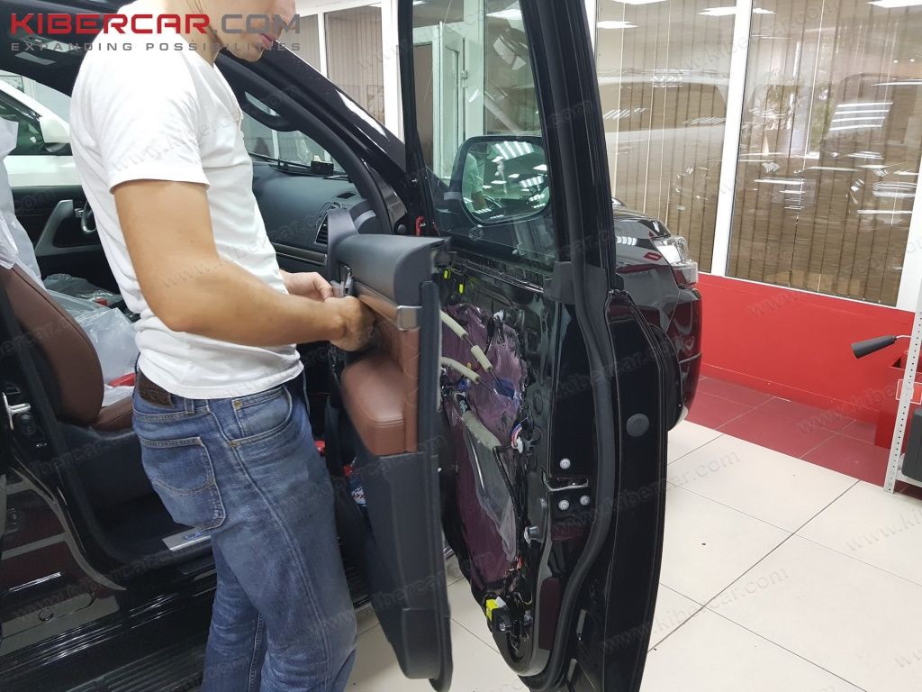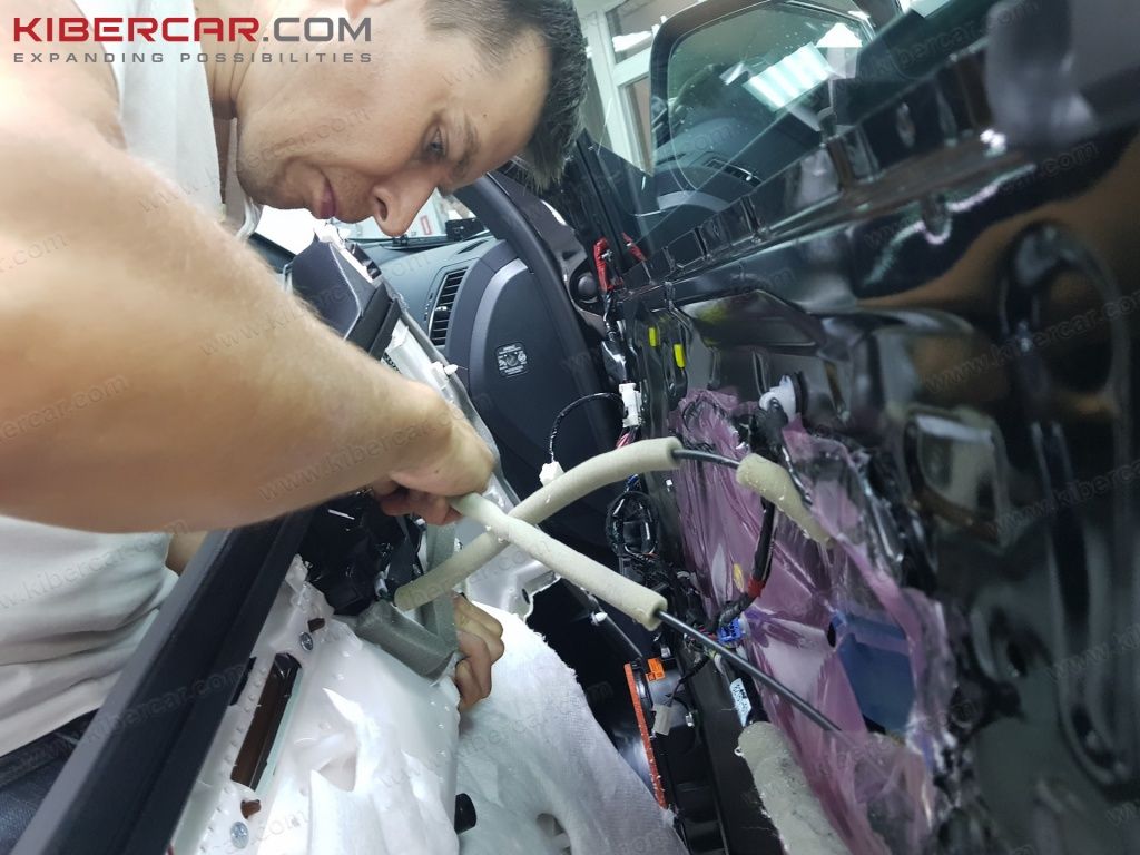 Для начала работы мы подготавливаем автомобиль. Защитной пленкой упаковываем салон и места, наиболее подверженные повреждениям. Далее снимаем обшивку дверей, чтобы появился доступ к основным замкам.