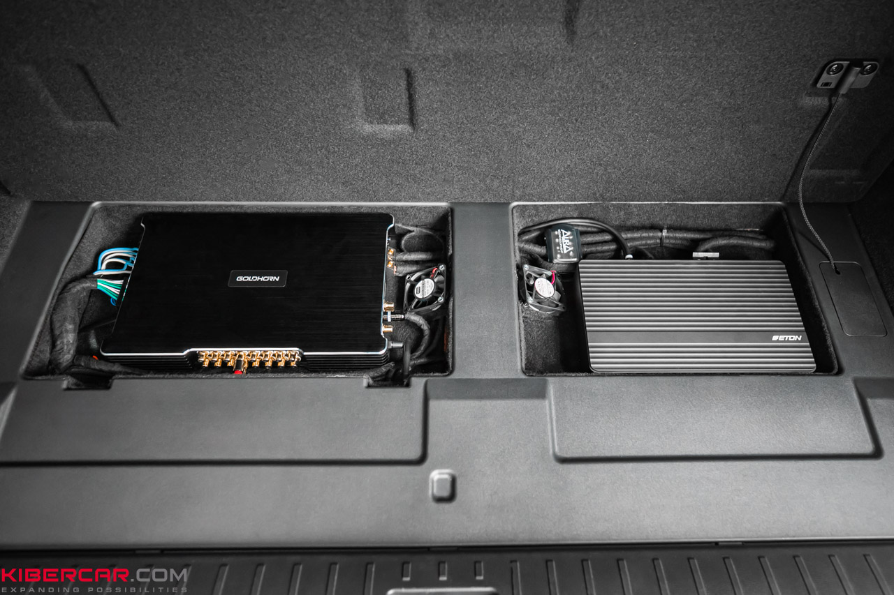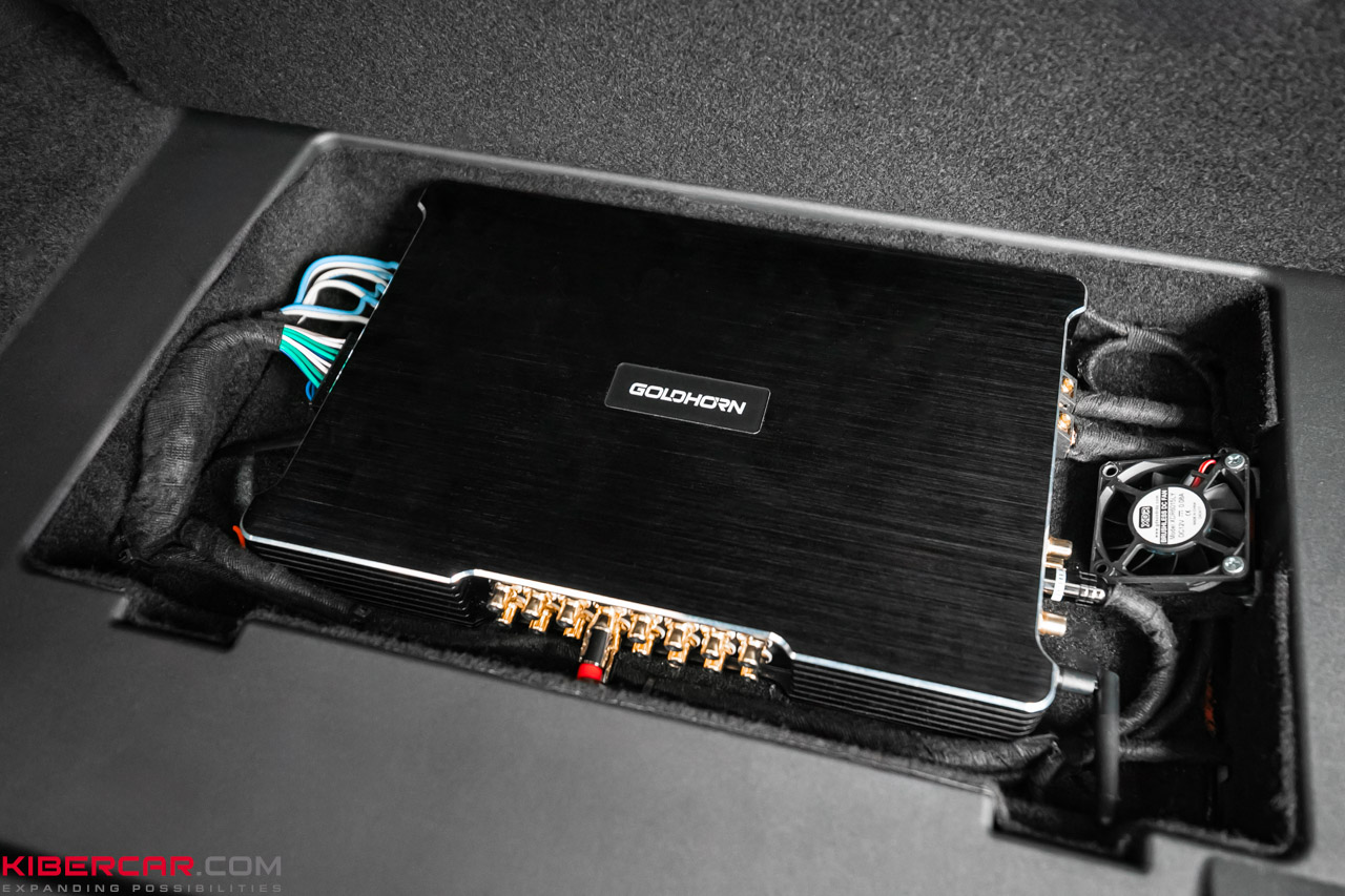 Для этого проекта выбрали процессорный усилитель Goldhorn DSPA 1616 Ultra. Это единственный девайс на рынке с функцией объемного звучания, как в домашнем кинотеатре. Шестнадцати каналов оказалось достаточно, чтобы подключить фронтальную и тыловую акустику, 4 дополнительных потолочных динамика, центральный канал в торпеде, задние сурраунды в крышке багажника.