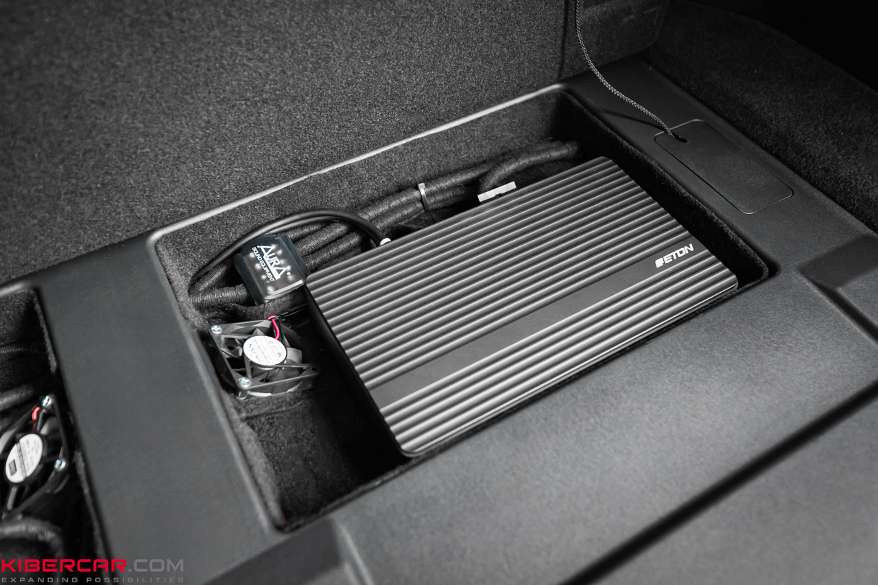 В подполье разместили процессорный усилитель и моноблок Eton MA. В качестве завершающего этапа выполнили настройку: разобрались со звуковыми задержками и тональной компенсацией, общей амплитудно-частотной характеристикой системы. Настроили 3 пресета: первый – с акцентом на водительское место, второй – с равномерными задержками по всем местам в салоне, и третий – для уличного прослушивания. Переключать пресеты можно при помощи пульта, который мы расположили в очечнике.