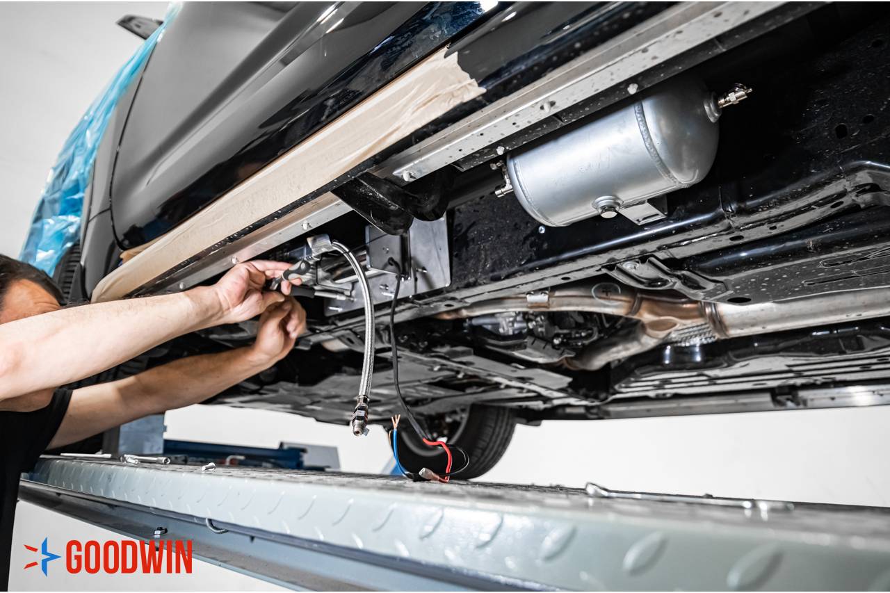 Решение: мы установили систему подкачки колес Goodwin и воздушный сигнал с ресивером в штанные места рамы Land Cruiser 300, без сверления.