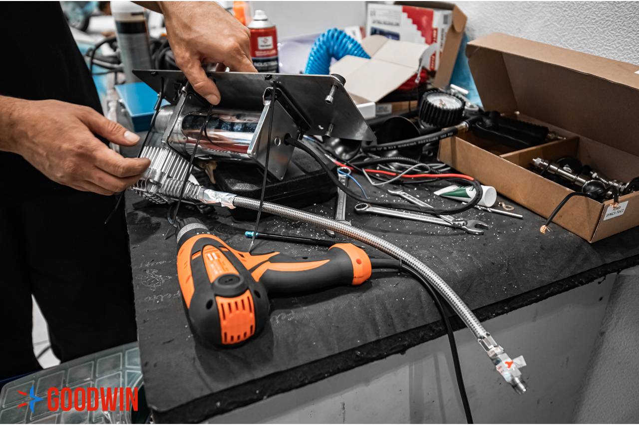Также в качестве задачи нам было поставлено разработать комплект крепежей, который позволит установить систему GOODWIN без изменения конструкции и серьезной доработки автомобиля. Нашими конструкторами были сделаны специальные кронштейны крепления, которые позволили установить компрессор и ресивер на раму автомобиля без ее сверления. Преимуществом установки на раму является не только установка в штатные места, но и удобство обслуживания системы. Конденсат, который скапливается в ресивере можно теперь сливать без демонтажа самого ресивера, достаточно открутить болт, что очень удобно и экономит средства владельца.