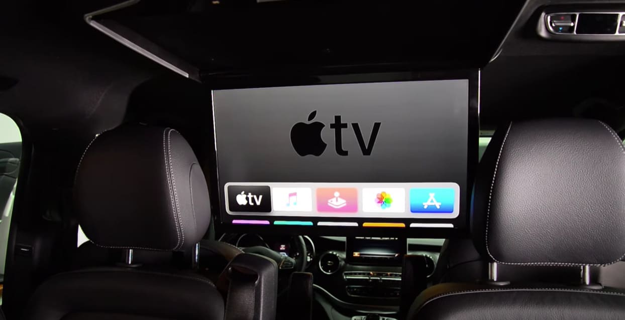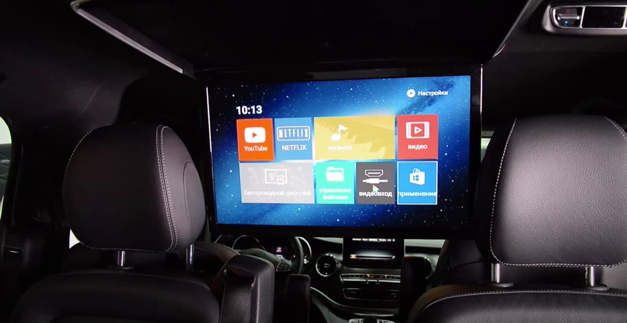 Затем встал вопрос: как установить большой монитор на потолок Mercedes, если посередине и так находится штатная система климат-контроля? Наши мастера легко решили проблему: перенесли климат-контроль вправо, а на его месте появился 22-дюймовый монитор с операционной системой Андроид. Дополнительно мы установили Apple TV, и теперь возможности мультимедиа практически безграничны! А главное – предусмотрели два варианта вывода звука: через сам монитор и через аудиосистему (для этого в бардачке предусмотрена специальная кнопка). Для большего комфорта мы установили в салоне инвертор и 2 розетки на 220В.