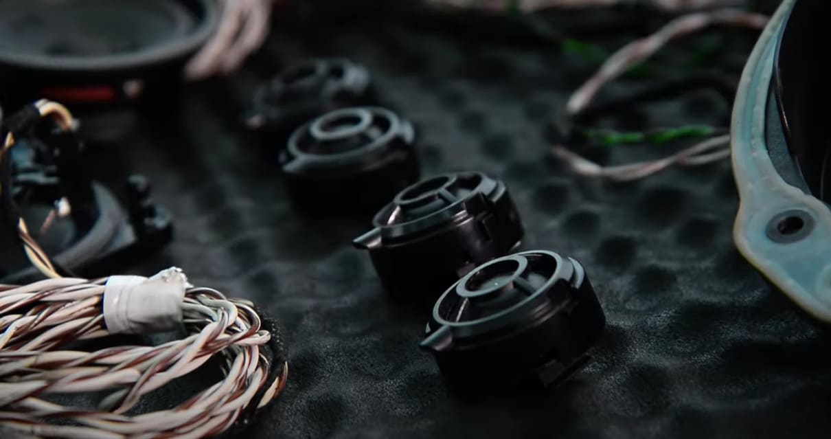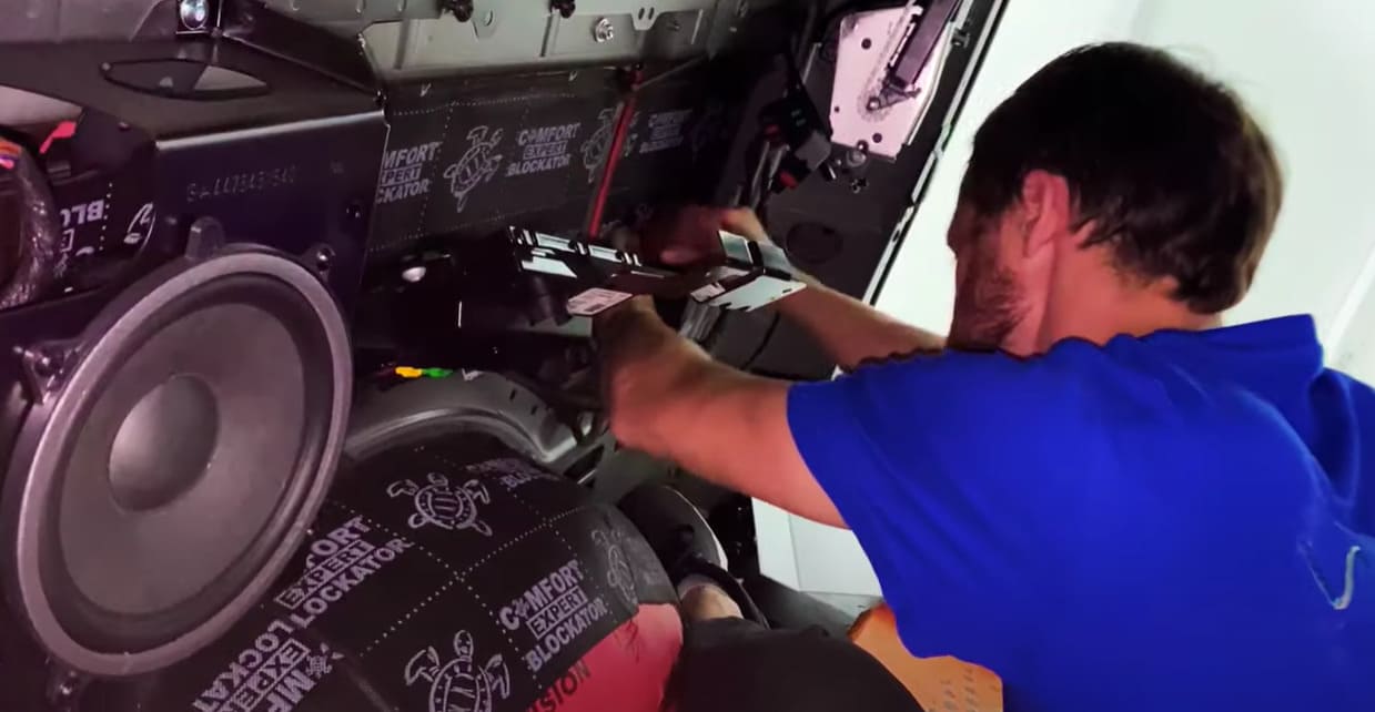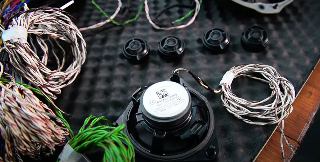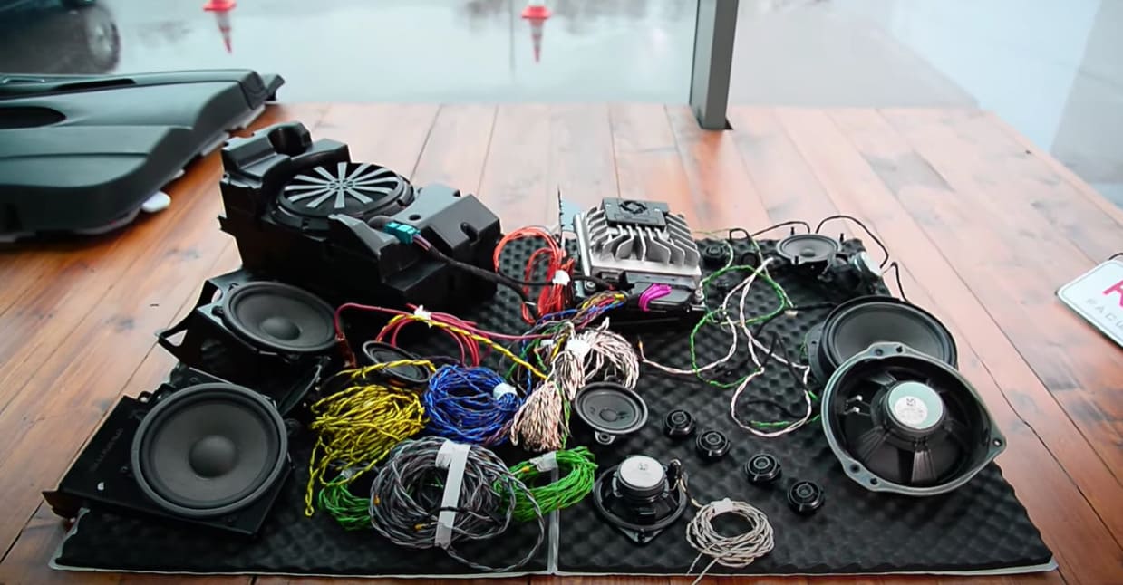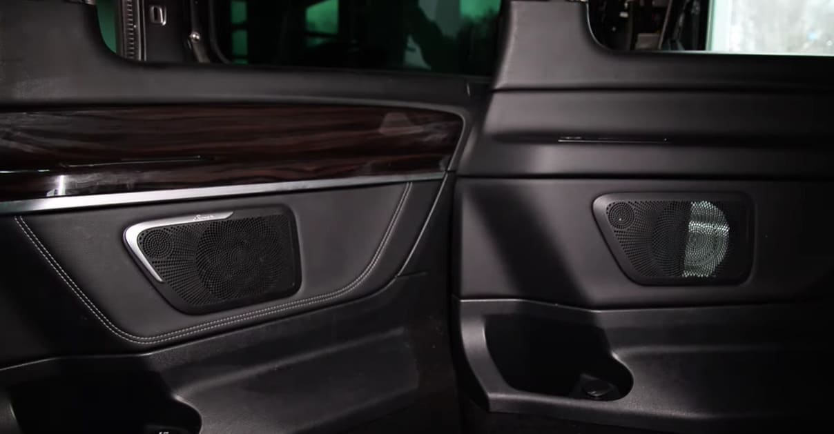 Далее мы поработали над аудиосистемой, так как качество штатных колонок не столь идеально, как хотелось бы владельцу. Установили акустическую систему Burmester – полный комплект из 16 динамиков, и синхронизировали его с головным устройством. Адаптировали новые дверные карты под автомобиль и монтировали в них дополнительных звуковые элементы.