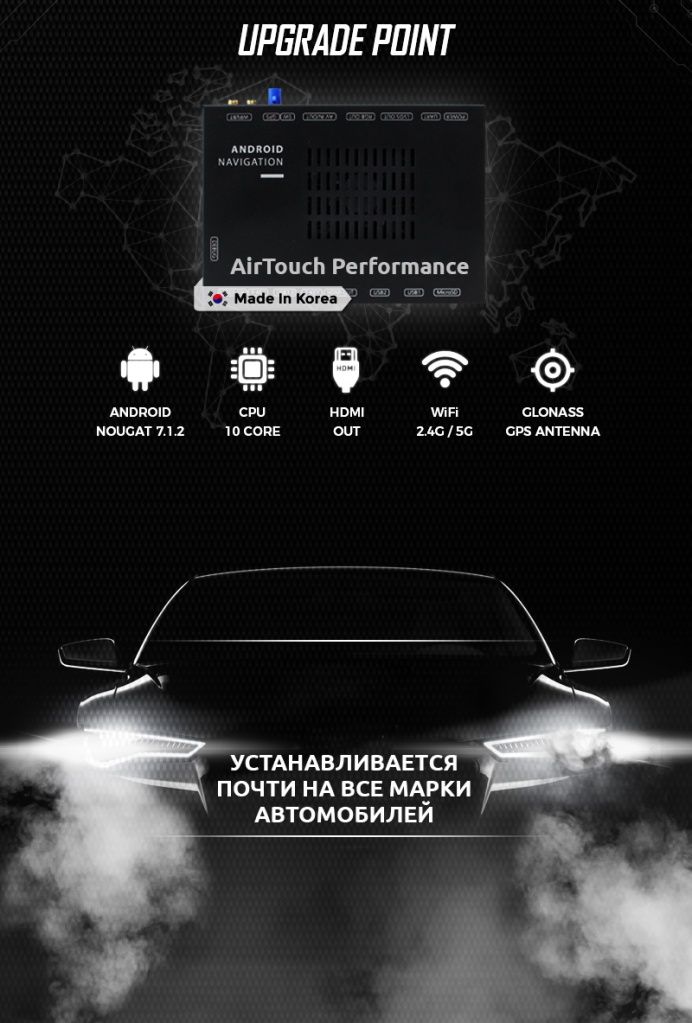 AirTouch Performance – оборудование созданное компанией Kibercar. Это навигационно-мультимедийный блок, работающий на базе ОС Android, который расширяет возможности штатного монитора автомобиля. Управление всеми опциями происходит при помощи штатных кнопок, с оригинального джойстика или сенсорного стекла (в зависимости от модели и комплектации автомобиля). Устройство создано специально для использования в автомобилях, подключается и работает со всеми видами штатных (оригинальных) мониторов.