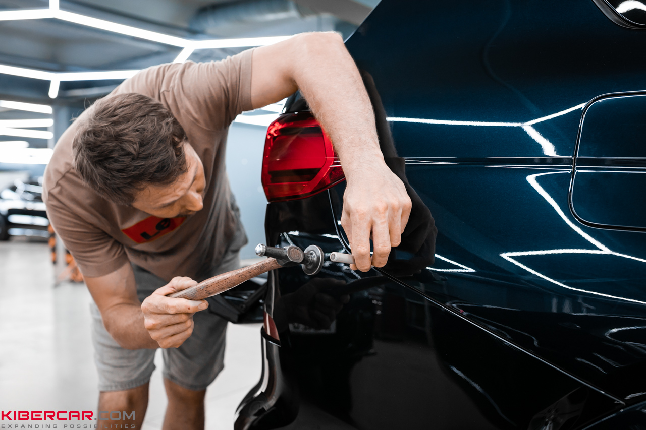 Удаление вмятин — это кропотливая работа, которая требует не только профессионализма мастеров, но и специализированного оборудования. В случае с BMW X7 вмятина находилась на границе двух кузовных панелей, что значительно усложняло процесс её удаления. Такие зоны обладают повышенной жёсткостью, а доступ к ним ограничен из-за конструктивных особенностей автомобиля.