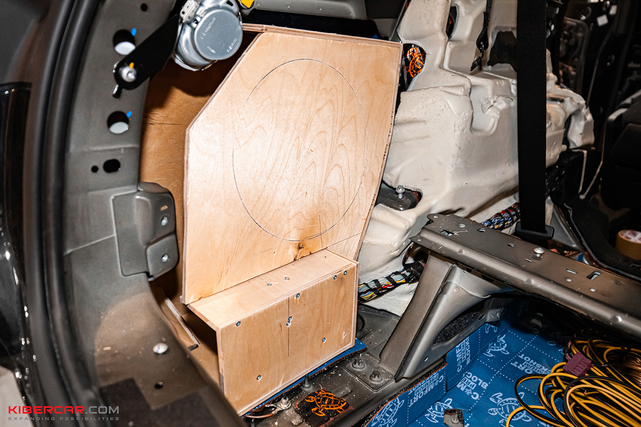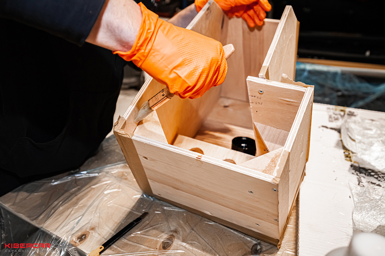 Первой задачей была установка сабвуфера. Наши мастера приняли решение вмонтировать сабвуфер в крыло автомобиля: замерили пространство под обшивкой и вручную изготовили короб, который укрепили композитным материалом из стеклоткани и эпоксидной смолы для лучшей защиты и правильной проводимости звука.