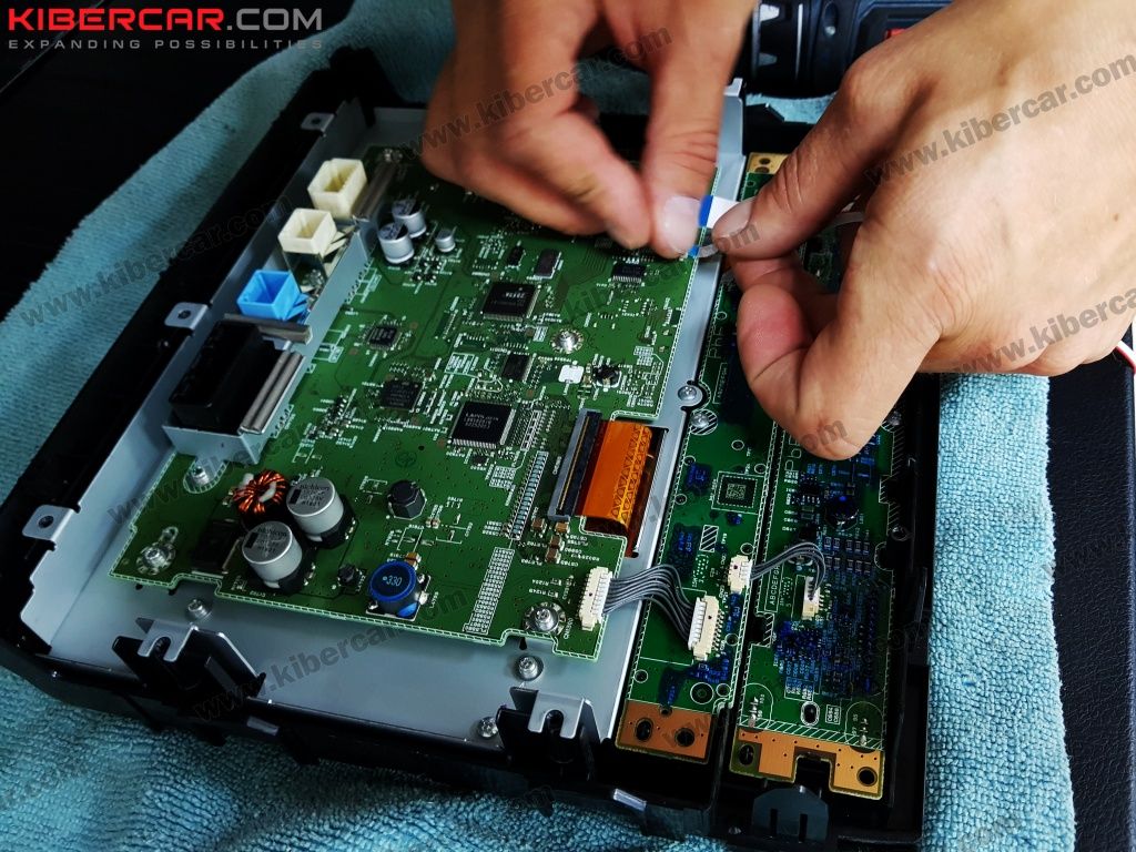 Снимаем центральную консоль. Отсоединяем штатный монитор и устанавливаем коммутатор. Благодаря нему, будет идти перераспределение сенсорного управления во время переключения между интерфейсами.