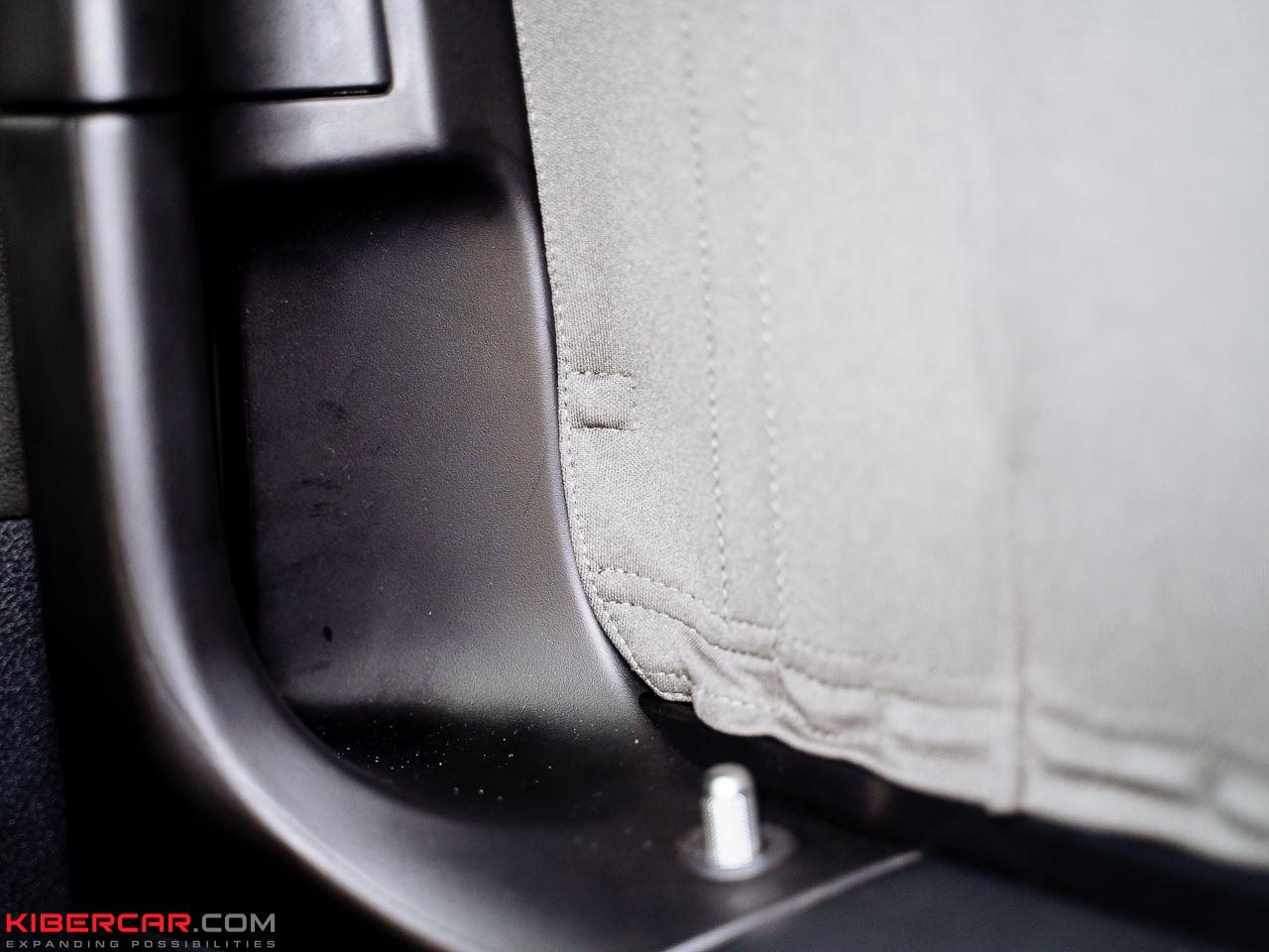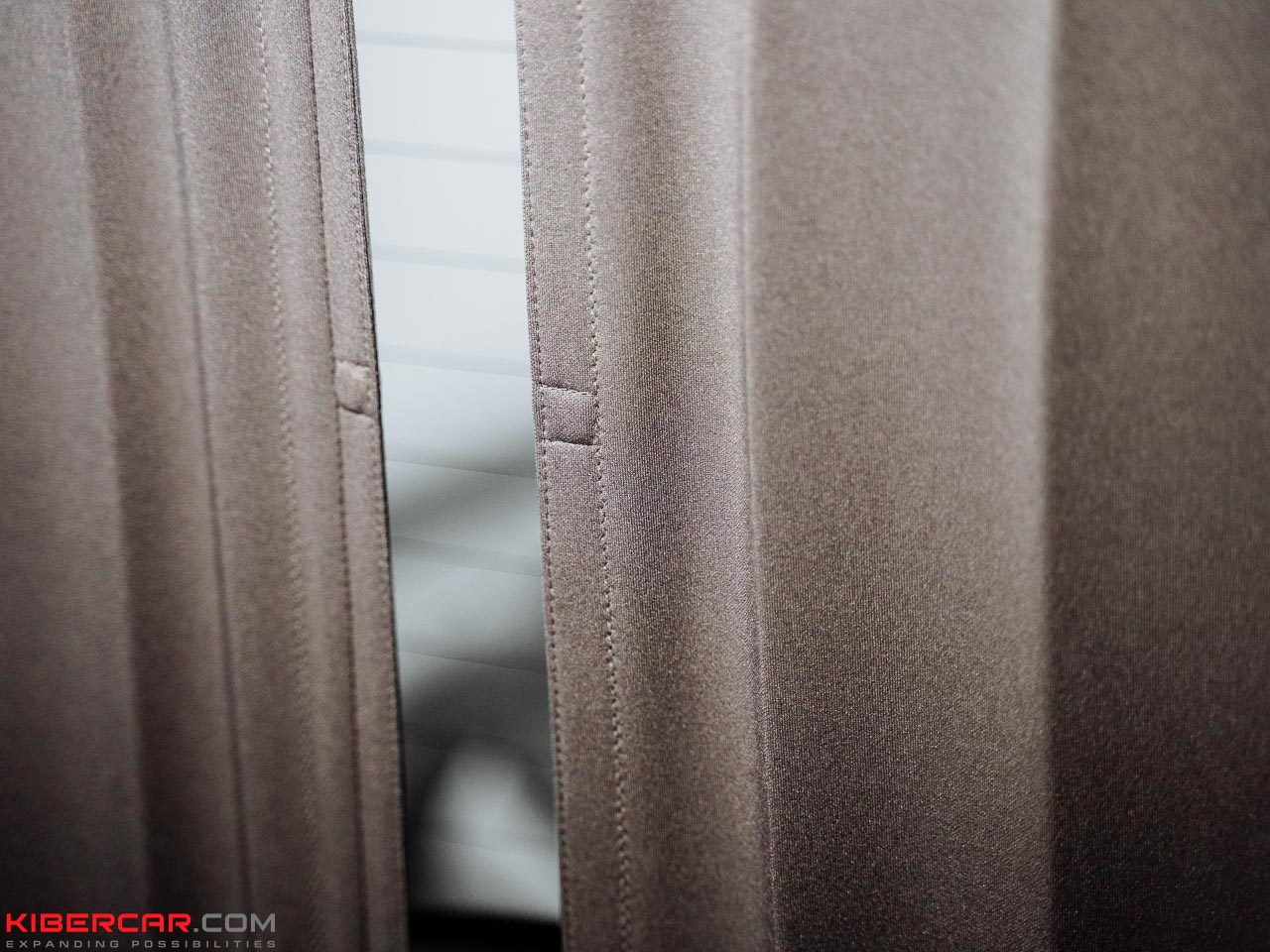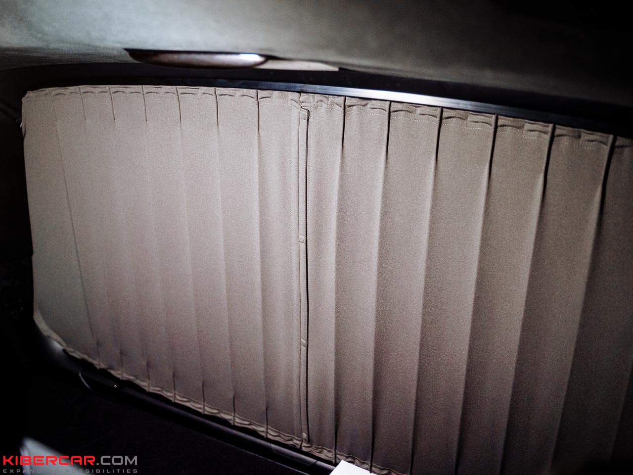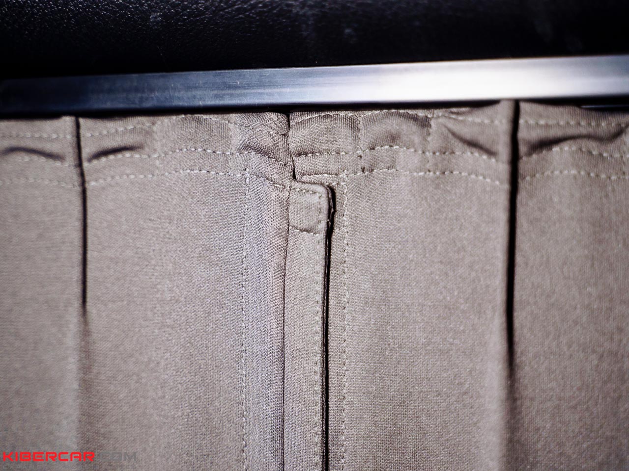 Штора, установленная на двери багажника, состоит из двух элементов, которые можно раздвинуть с центра. Такое решение более эстетичное и практичное. По краю каждой из этих шторок вшиты магниты, благодаря которым при закрытии ткань натягивается и не провисает, центр закрывается плотно. Аналогично магниты установлены и для закрепления штор на других окнах.
