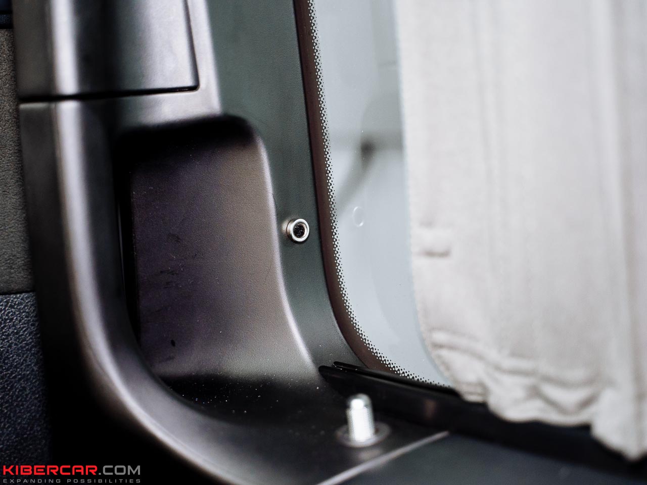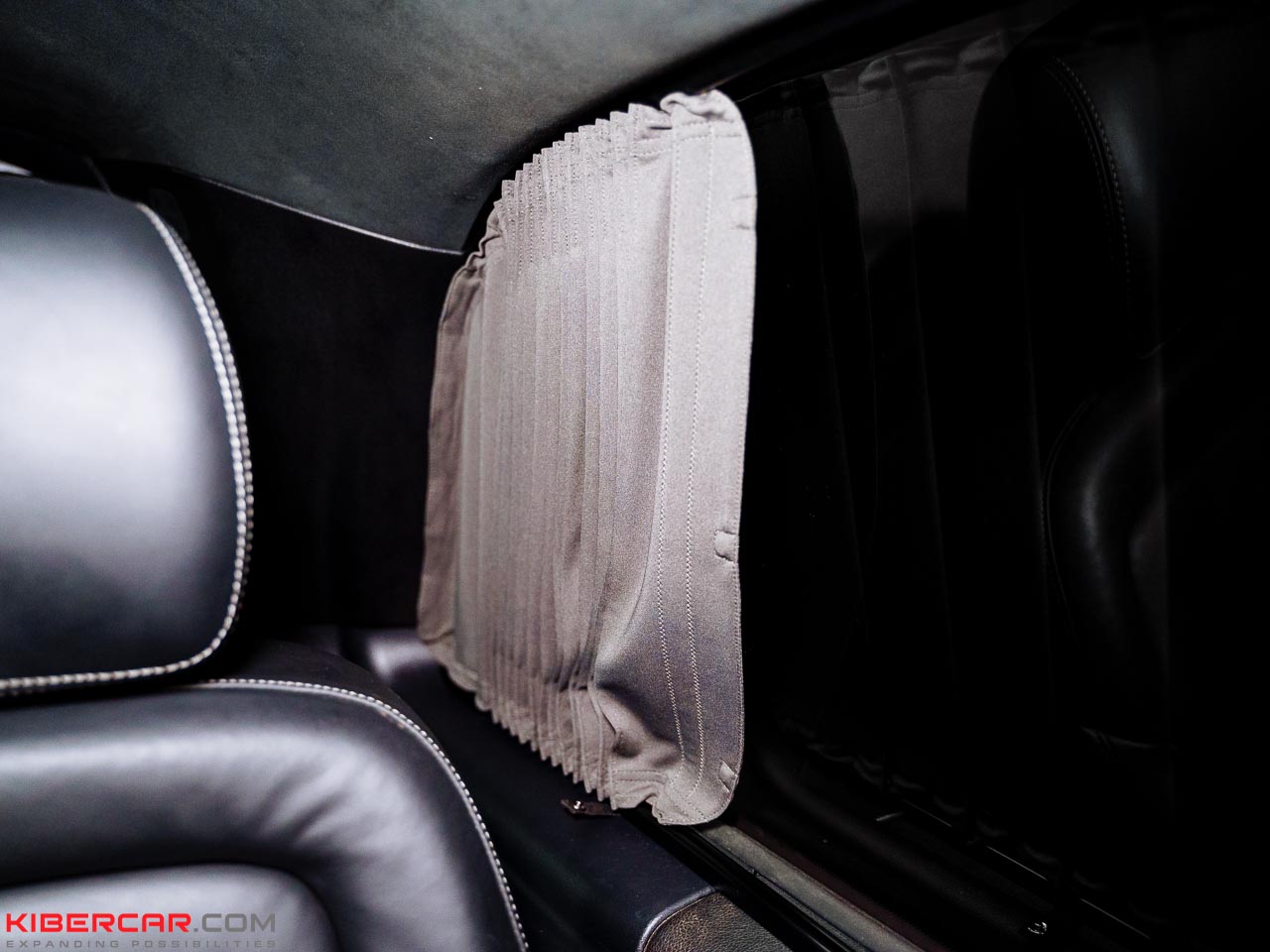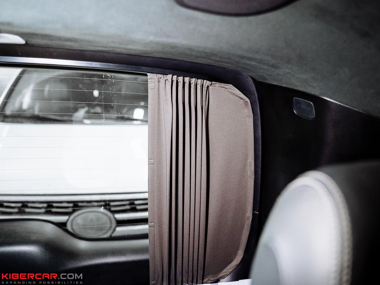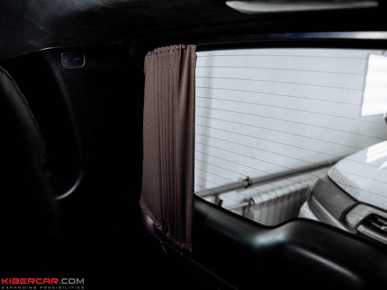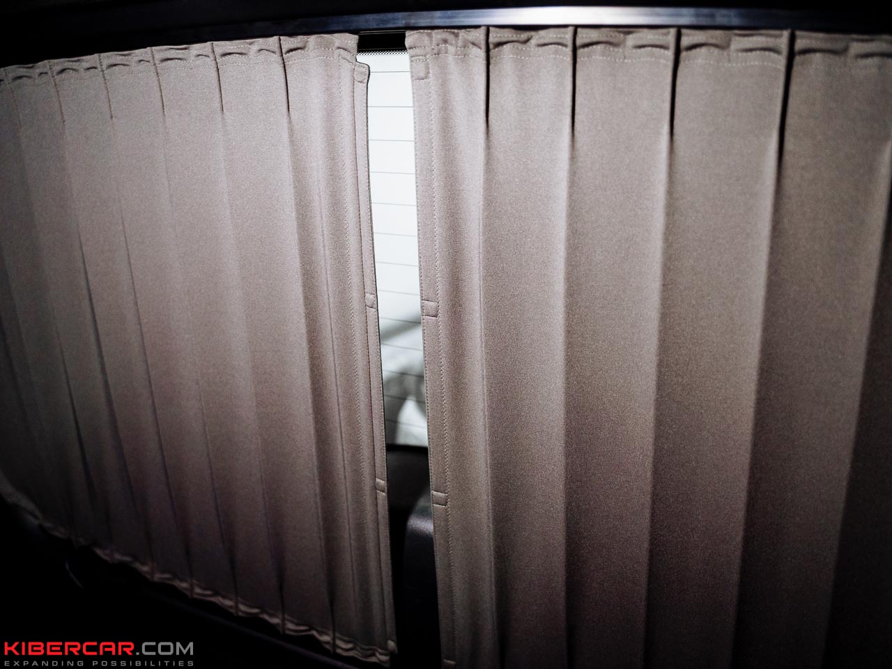 Штора, установленная на двери багажника, состоит из двух элементов, которые можно раздвинуть с центра. Такое решение более эстетичное и практичное. По краю каждой из этих шторок вшиты магниты, благодаря которым при закрытии ткань натягивается и не провисает, центр закрывается плотно. Аналогично магниты установлены и для закрепления штор на других окнах.