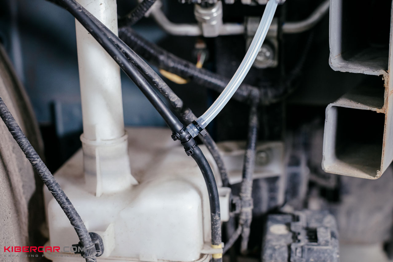 Установив омыватель, мы подключили его при помощи тройника к системе омывания переднего стекла. Омыватель будет срабатывать каждый раз, когда водитель пользуется функцией омывания переднего стекла: одновременно будет очищаться от загрязнений и камера.