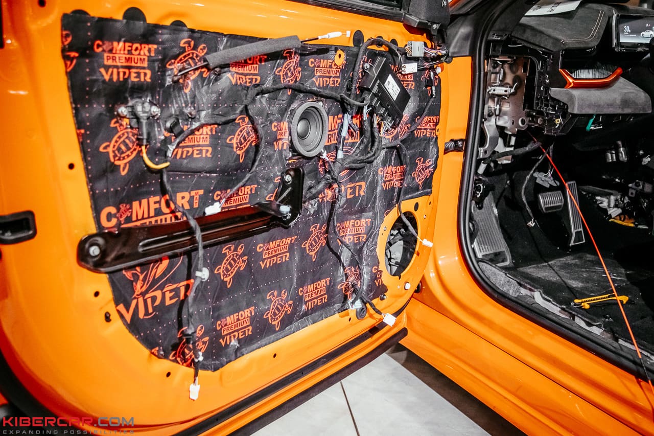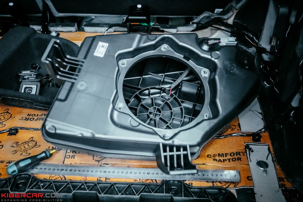 Также наша команда установила новую акустику в передние двери, твитеры в уголках за зеркалами, другие динамики в дверной карте. В задних дверях появились задние динамики.