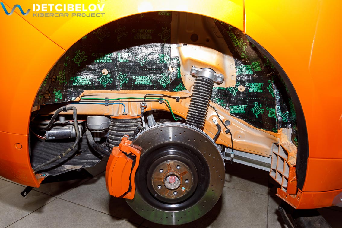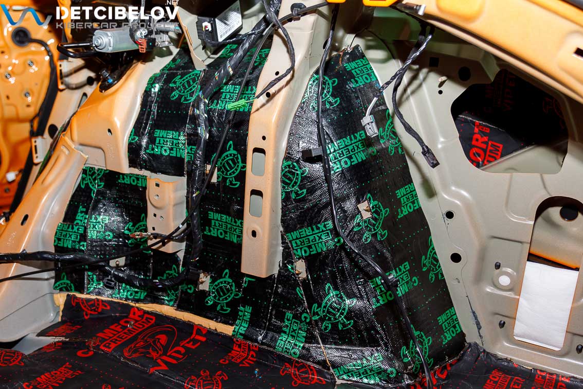 В процессе дооснащения оклеиваются двери, пол и потолок, проходит отделку багажное отделение. Полная шумоизоляция предусматривает также работу с колесными арками, подкрылками, капотом и крышкой багажника. Благодаря такому подходу, снижается уровень вибрации, исчезает скрип пластика, существенно снижается шумность. Дополнительный плюс шумоизоляции состоит в том, что штатная акустика автомобиля приобретает более глубокое и приятное звучание.