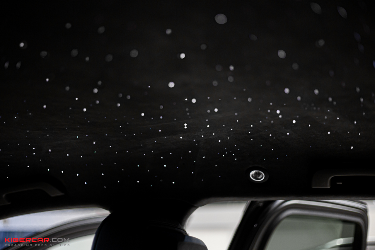 Первым этапом стала перетяжка крыши в алькантару - запатентованный отделочный материал, который также известен как искусственная замша. Производится итальянским брендом Аlcantara SpA. Преимущества данной ткани в том, что она очень прочная, легко очищается от загрязнений и имеет премиальный внешний вид – бархатная матовая поверхность отлично вписывается в образ Звездного неба. Алькантару производят из переработанных материалов, текстура настолько крепкая, что может затупить нож во время вырезания необходимых отверстий.