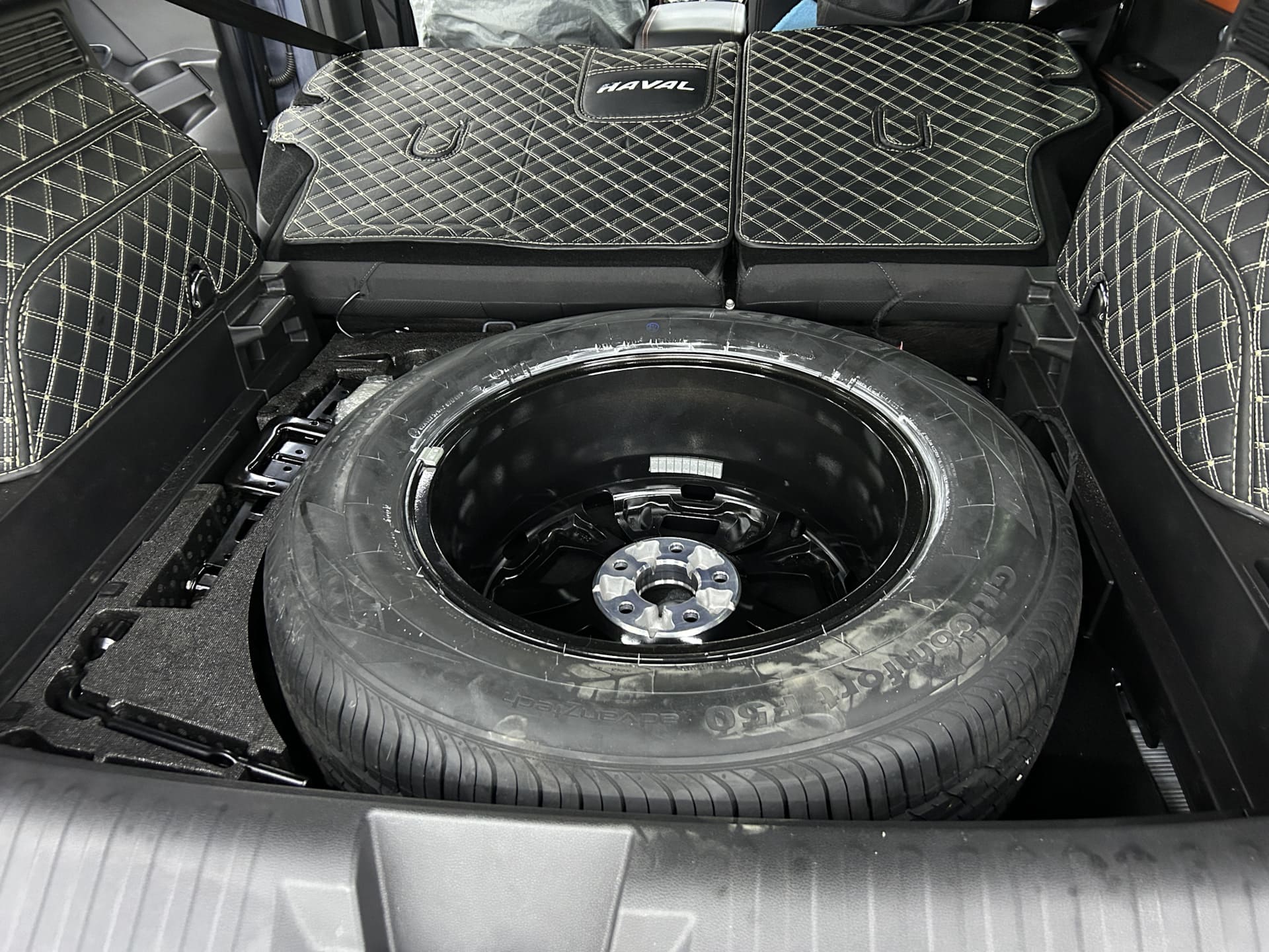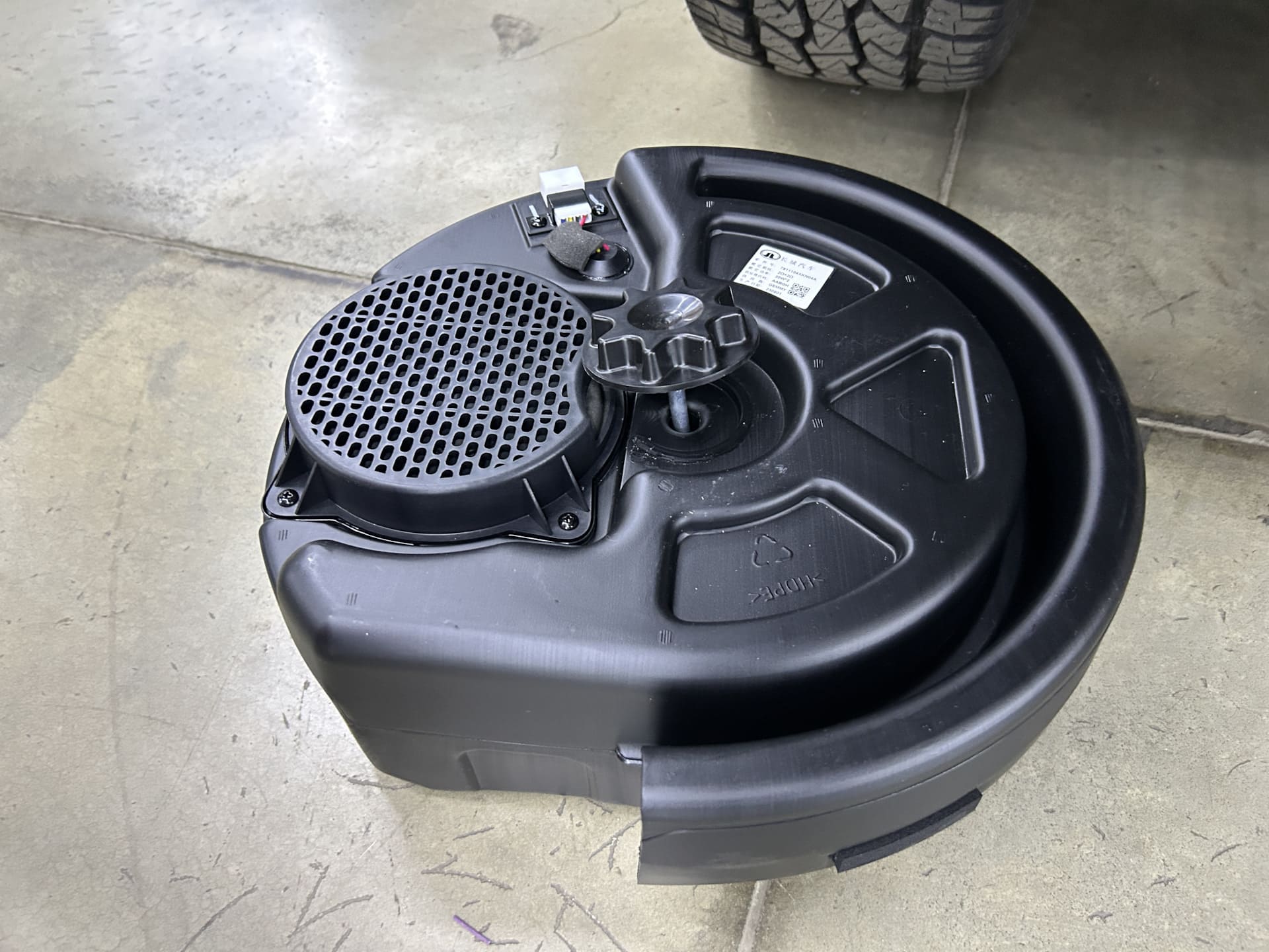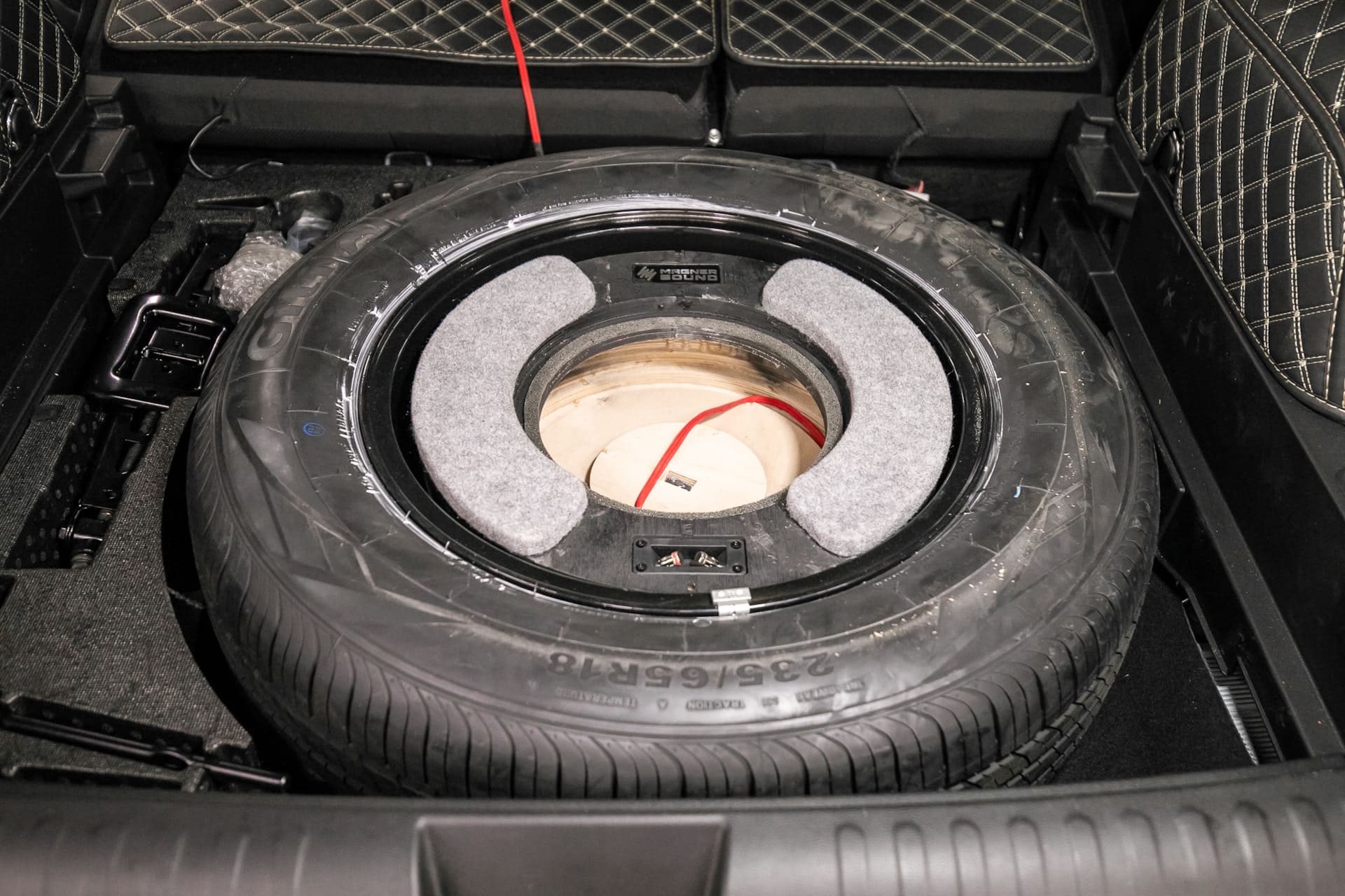 Время выполнения работ предполагалось до позднего вечера. В реальности закончили уже к 16:00. Ощущается, что у ребят богатый опыт наработок и мастерство. Первая же заготовка практически сразу встала идеально. Вы, наверное, видели. Что штатный саб крепится вместе с запаской насквозь шпилькой. Здесь же динамик кратно большего размера и шпилькой насквозь не воспользуешься. Так вот, небольшую шпильку ребята встроили в корпус самого саба снизу, так что запаска и сам саб не болтаются, а крепко держатся в штатное отверстие.