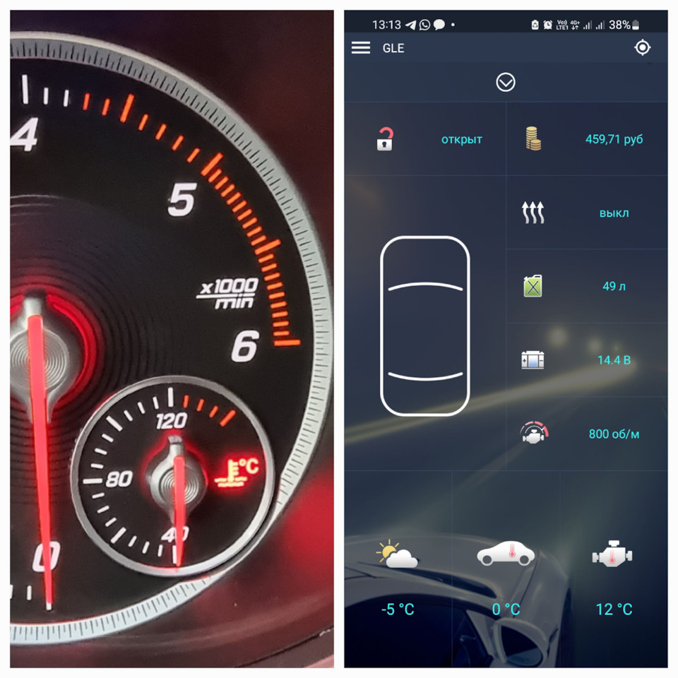 13:10 отопитель выключен, показометры температур имеют большую погрешность. т.к. снег на стекле уже растаял при этом в салоне пишет -1. Температура ОЖ снимается на верхнем большом патрубке
