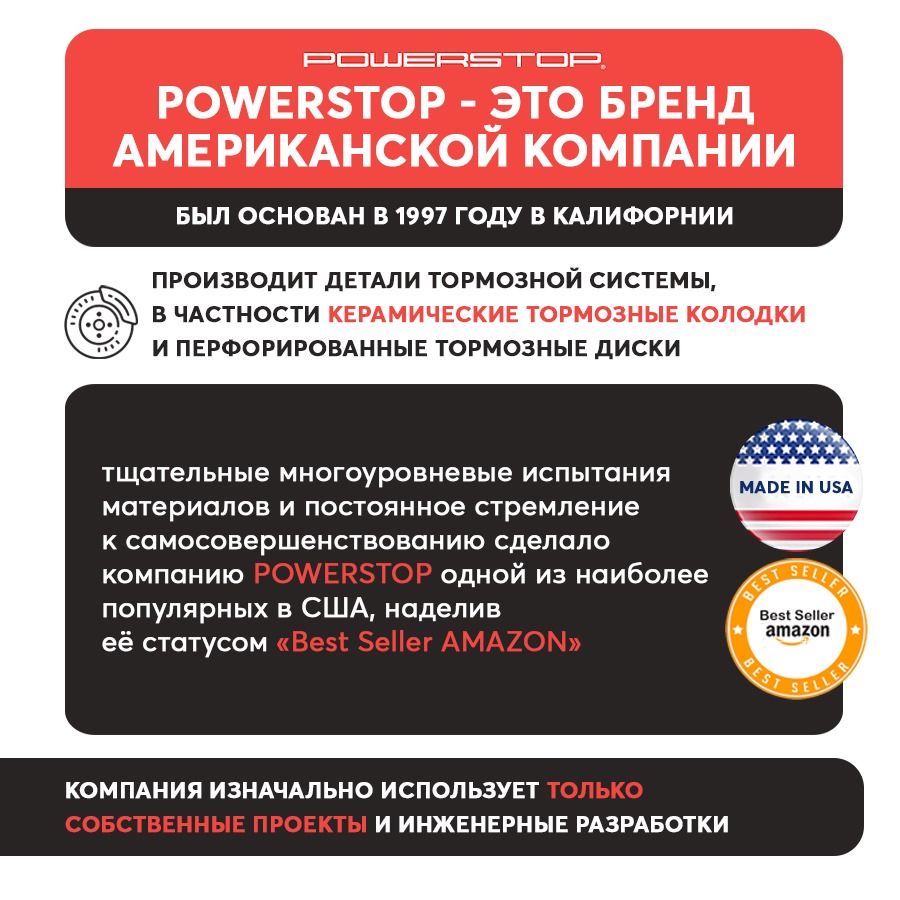PowerStop – американский бренд, который применяет только собственные разработки и со всей ответственностью испытывает материалы, чтобы добиться отличного результата. Элементы для тормозных системы прекрасно подходят для эксплуатации в условиях российского климата. Чтобы узнать, подходят ли комплектующие PowerStop для вашего автомобиля, отправьте онлайн-заявку или звоните. Будем рады проконсультировать и помочь выбрать удобное время для визита в наш установочный центр.
