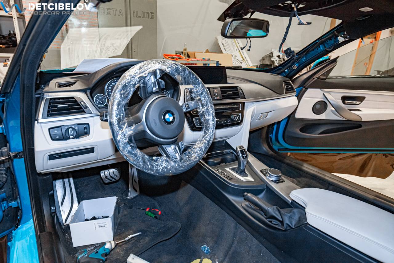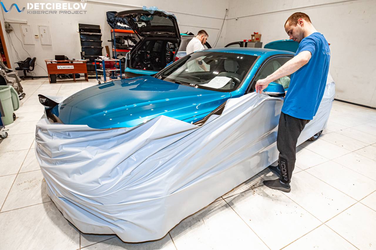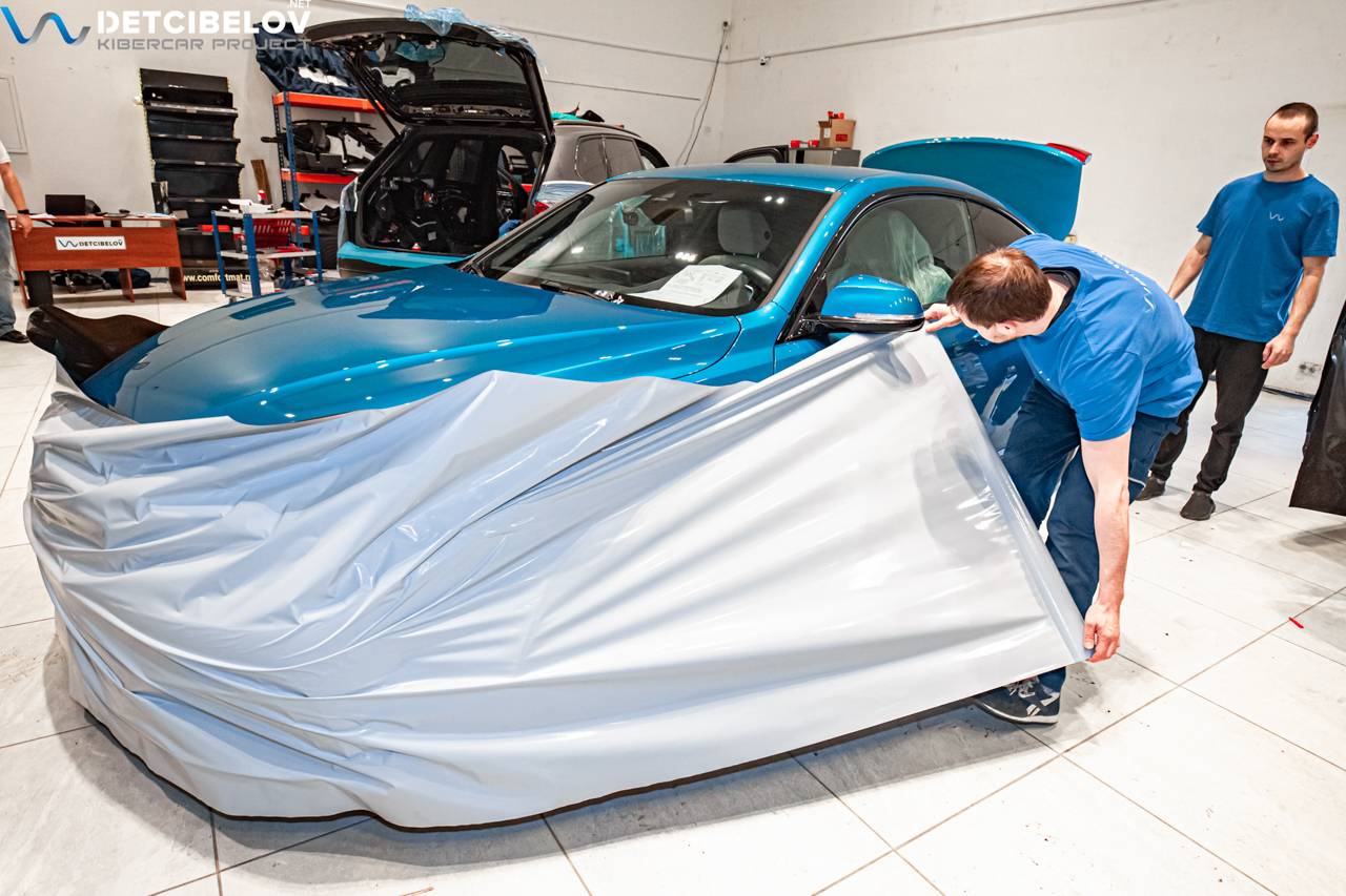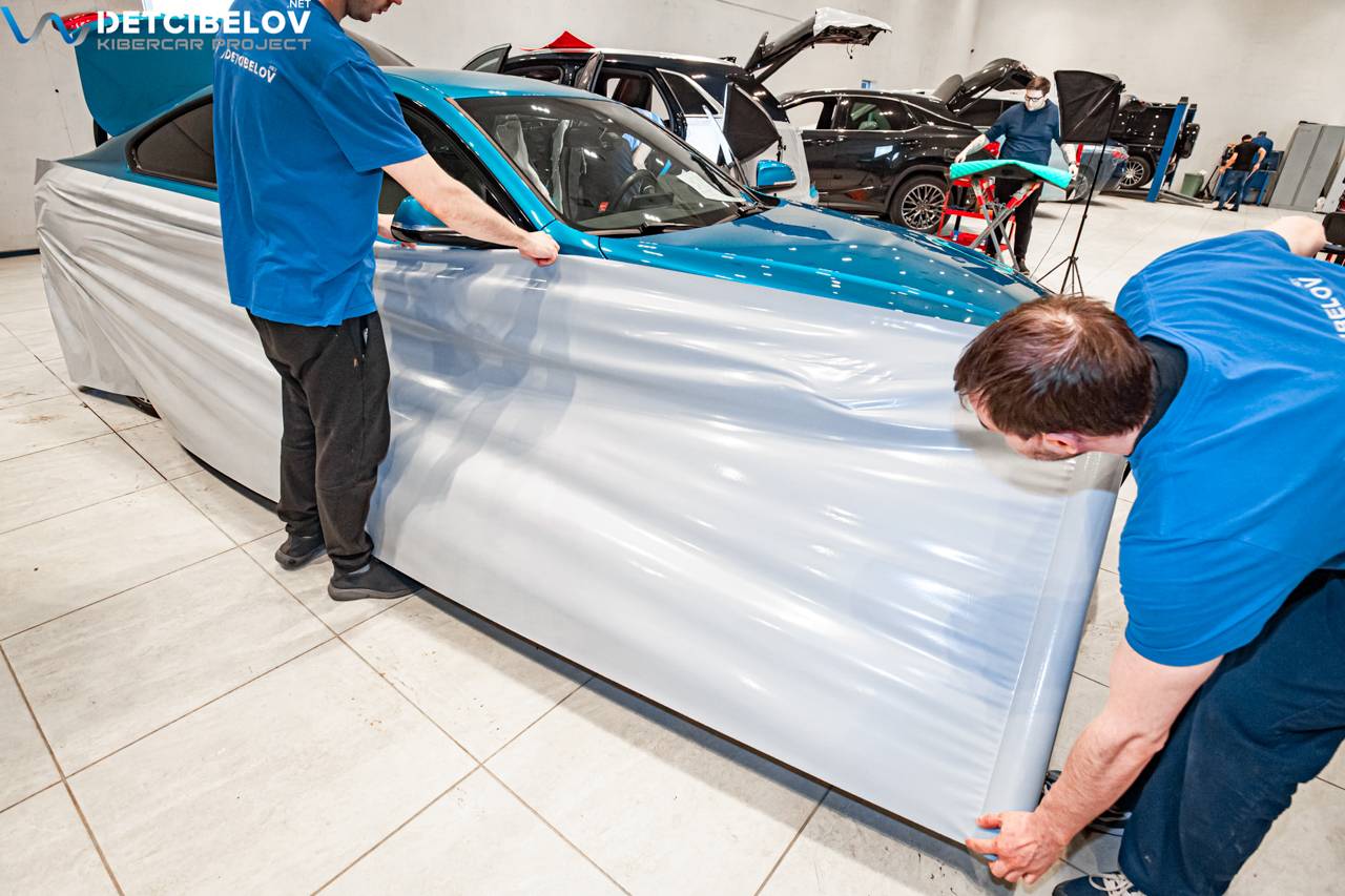 Приступаем к работе. Первым делом максимально защищаем автомобиль: оклеиваем пленкой все внешние элементы автомобиля, затем наносим скотч на пороги и арки дверей, упаковываем все мелкие пластиковые элементы в стретч-пленку. Сиденья и карты дверей помещаем в специальные чехлы.