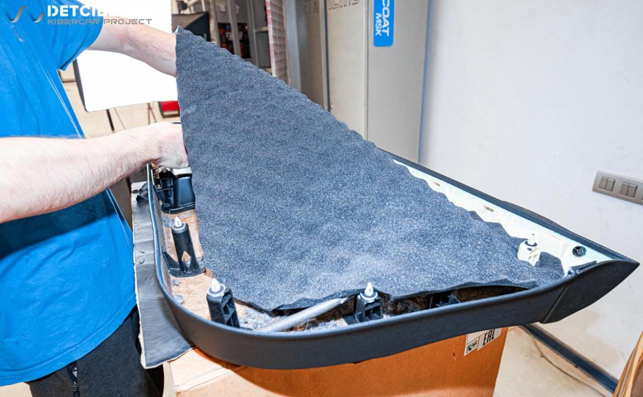 Следующий этап – шумоизоляция крыши. Максимально аккуратно чистыми одноразовыми перчатками демонтируем потолочную обшивку и обезжириваем поверхность потолка. После предварительной подготовки приступаем к шумоизоляции. Слой №1. Comfort mat Dark D3 Premium (3 мм) – облегченный виброизолятор. Слой №2. Comfort mat Skyline (5 мм) – мембранная звукоизоляция, которая выполнена на современном монтажном клее-герметике последнего поколения. Рабочая часть этого материала состоит из шумоизоляционной прослойки, накрытой плотной тонкой звукоизоляционной мембраной.