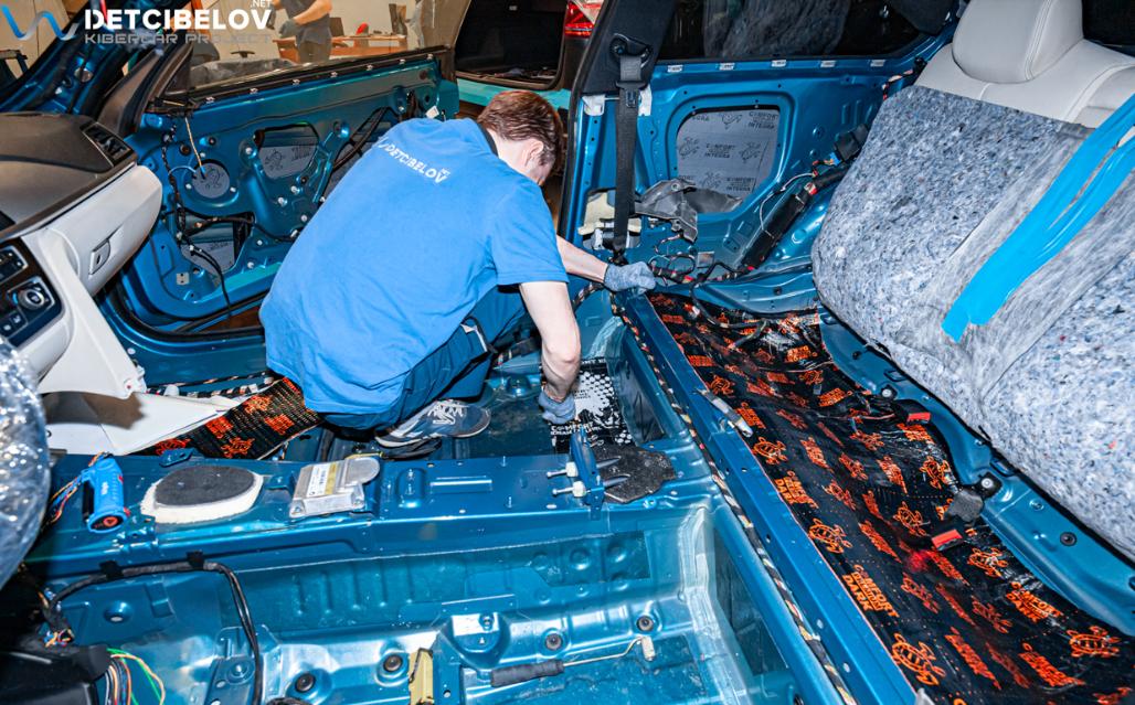 Далее приступаем к самой ответственной части шумоизоляции автомобиля – пола, багажника и внутренних колесных арок. Данный этап начинается с полного демонтажа сидений, ковров, обшивок и т.д. – ничего не должно мешать проводимым работам.