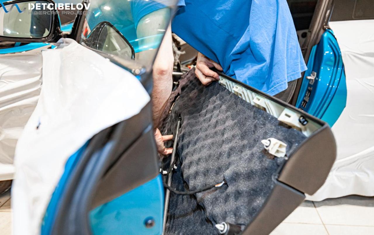 Работы по шумоизоляции начинаем с дверей. Максимально аккуратно разбираем дверные обшивки. После этого подготавливаем поверхность и обезжириваем все участки, на которые будут последовательно наноситься слои виброизоляционных материалов. Слой №1. Comfort mat Dark D3 Premium (3 мм) – облегченный виброизолятор. Слой №2. Comfort mat Integra (6 мм) – мембранная звукоизоляция, самая легкая из всех существующих. Сочетает в себе звуко и теплоизолирующие свойства за счет применения уникальной акустической мембраны и многослойной структуры. Слой №3. Comfort mat Wave Expert (15 мм) – шумопоглощающий материал последнего поколения, который наносится на карты дверей. Эта пенополиуретановая пенорезина с увеличенным коэффициентом шумопоглощения окончательно задерживает посторонние шумы и одновременно выступает в роли антискрипа.