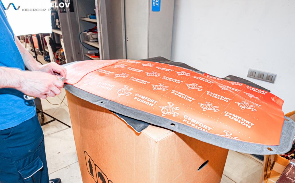 Для виброизоляции пола мы используем вибродемпфер Comfort mat Extreme 3.5 — это мастичнобитумный сэндвич с рекордной толщиной 3,5 мм и двумя слоями фольги, которые убирают низкочастотные структурные шумы металла. Это «Царь» среди виброизоляционных материалов с уникальной структурой мастики и лучшими показателями снижения вибрации. Нагреваем его при температуре 60-80 градусов в специальной печи – это обязательное условие, иначе качественно нанести этот материал не удастся. Его мы используем на полу и на задних колесных арках.